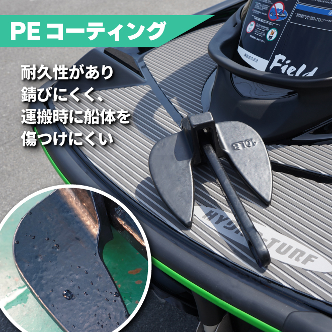 ・コンパクトでジェットユーザーに人気!PEコーティングアンカー ・PEコーティングで耐久性があり、錆びにくく、運搬時に船体を傷つけにくい ・爪が海底にめり込んでアンカリングするので、しっかりしたホールド性があります ・ロープ角度を30~40°にするとホールド性があがります ・砂地や砂利、泥などの地質でアンカリングしやすい ・ジェットスキーやミニボートなどに最適です |