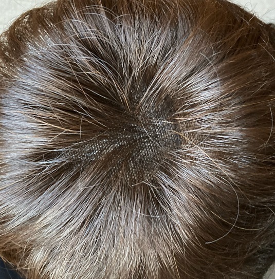 02:本物の肌のようなつむじと分け目 つむじ部分に、リアルな人工皮膚を採用。