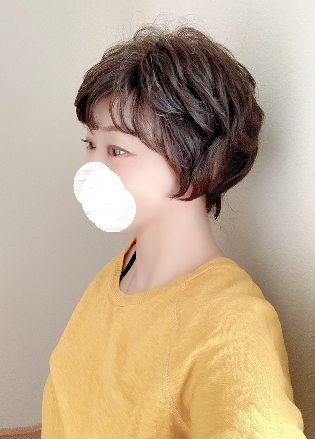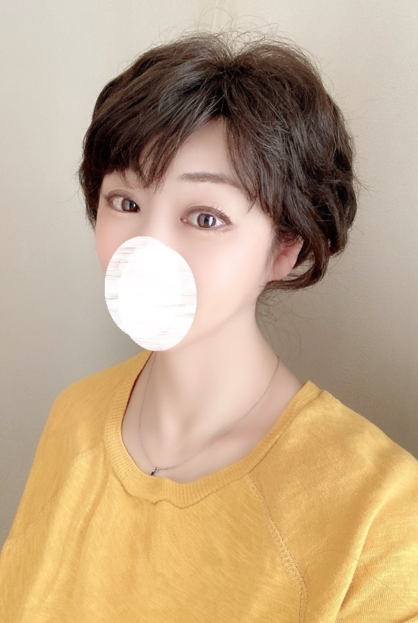 ※自毛をまったく見せずにスッポリかぶる「かつら」タイプのウィッグ。毛先のカールが強いタイプです。