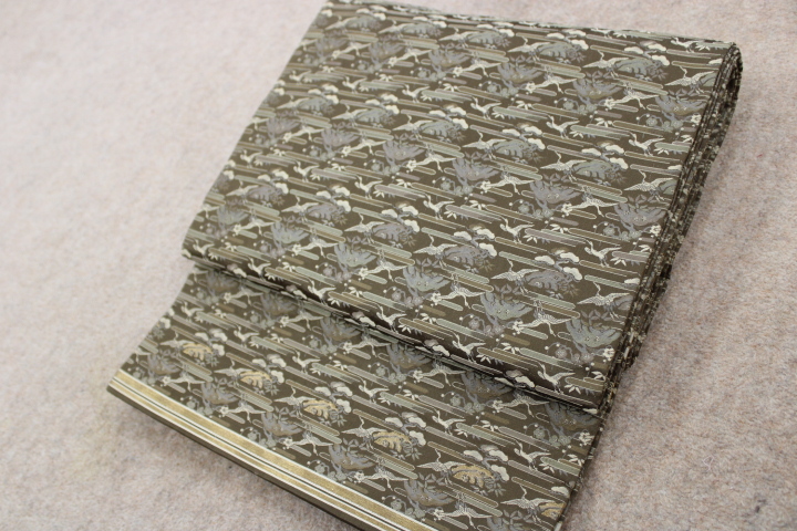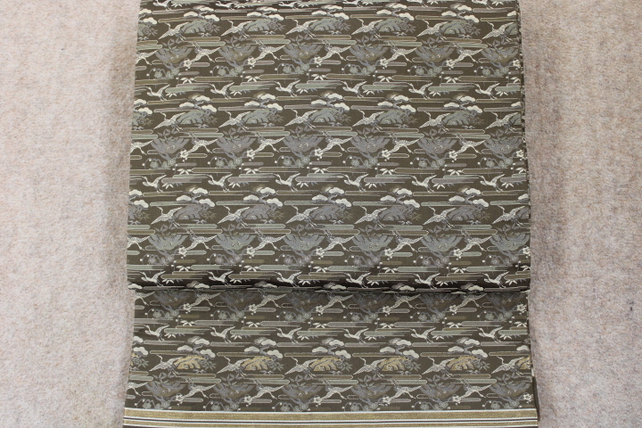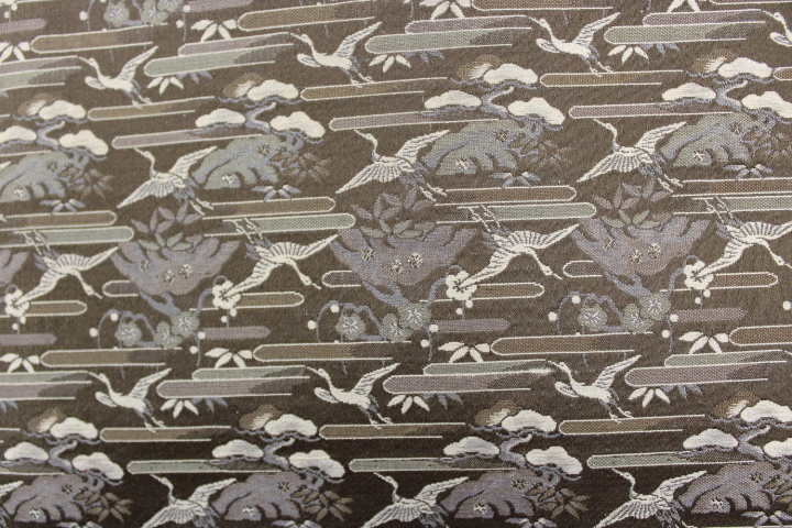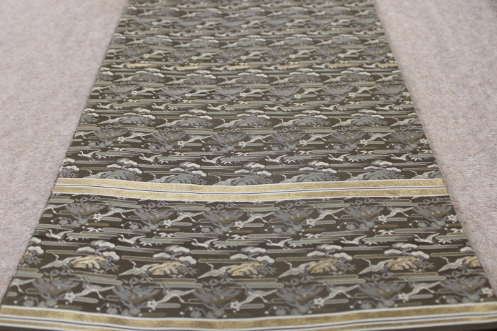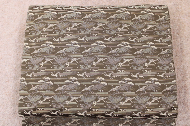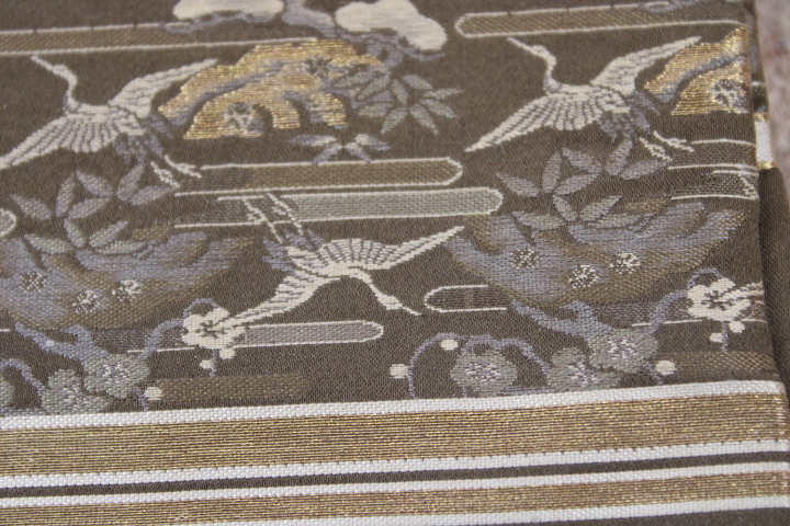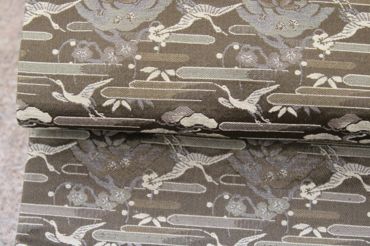 西陣織 正絹緞子織地 濃い煎茶色の老松・竹・梅・に舞鶴の柄