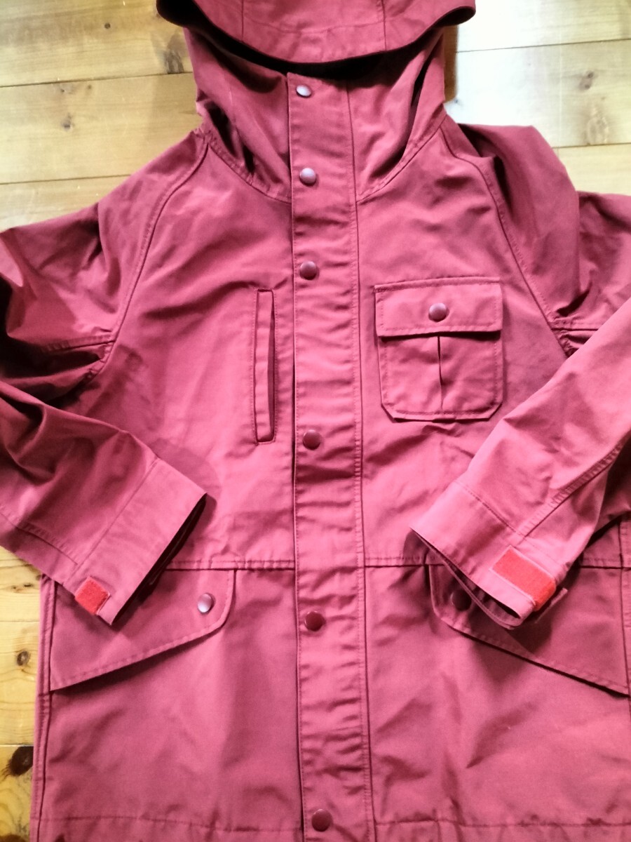 アーバンリサーチのマウンテンパーカーでSize40 (下記の平置きサイズを必ずご確認ください)でワイン・レッド系色(光の加減により発色が違う場合がありますがご容赦ください。写真7.8枚目は屋外での撮影です)になります。綿、ナイロン・60/40混で独特な光沢、風合いがあり存在感があります。細身なシルエットでアーバンリサーチらしいデザインです。