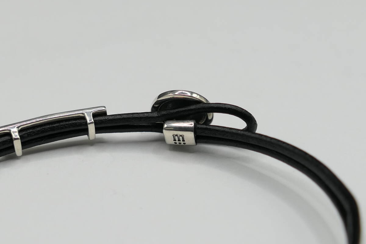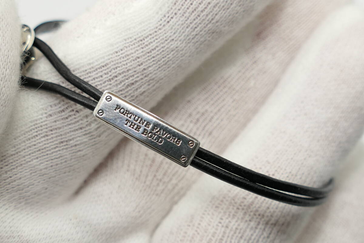 プレートにメッセージが刻まれた普段使いしやすいレザーブレスレット。