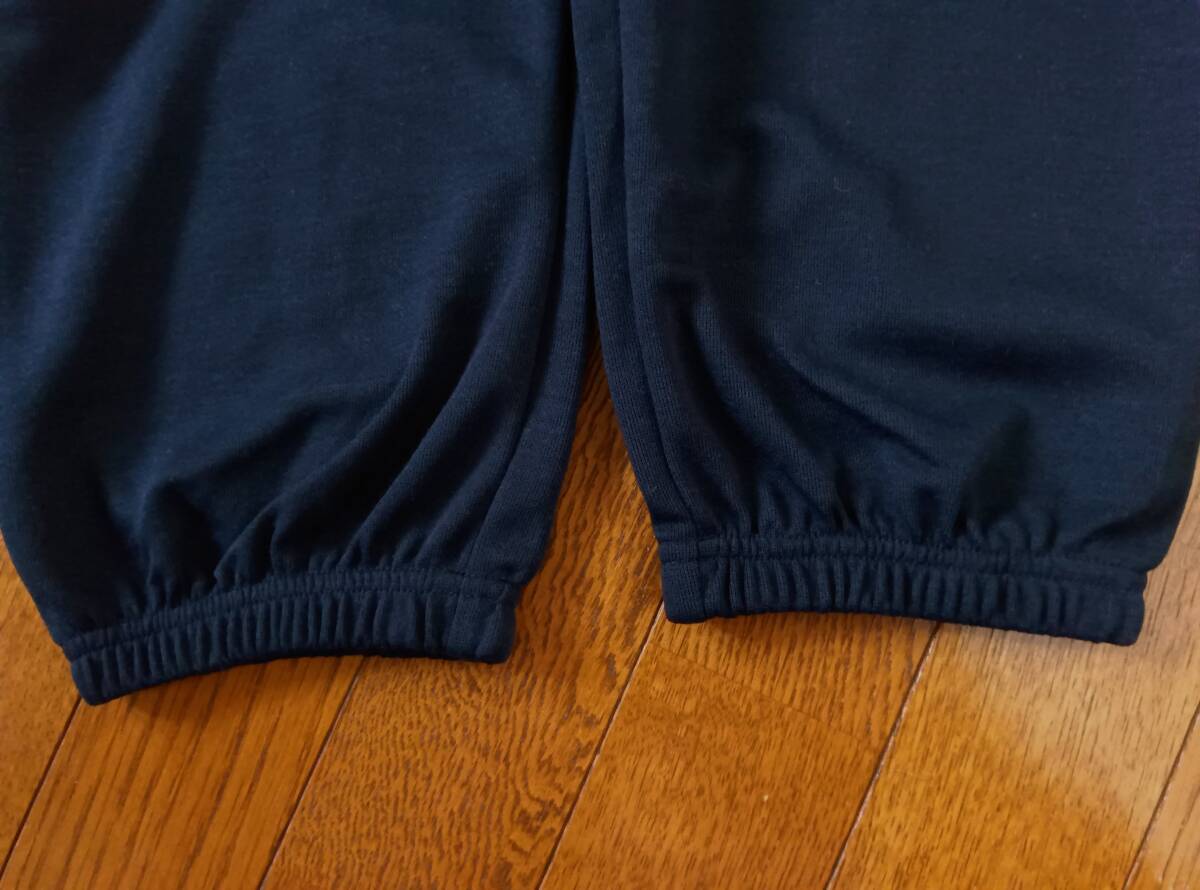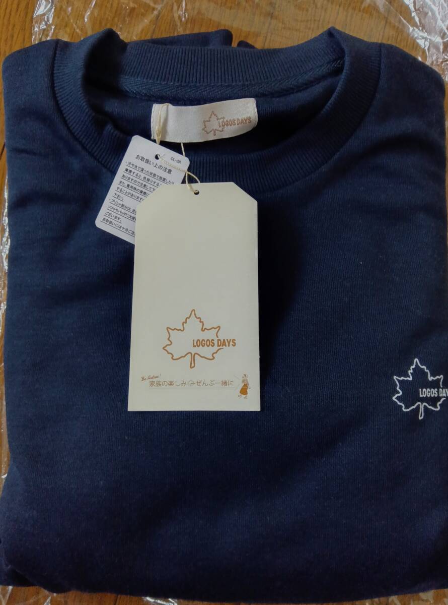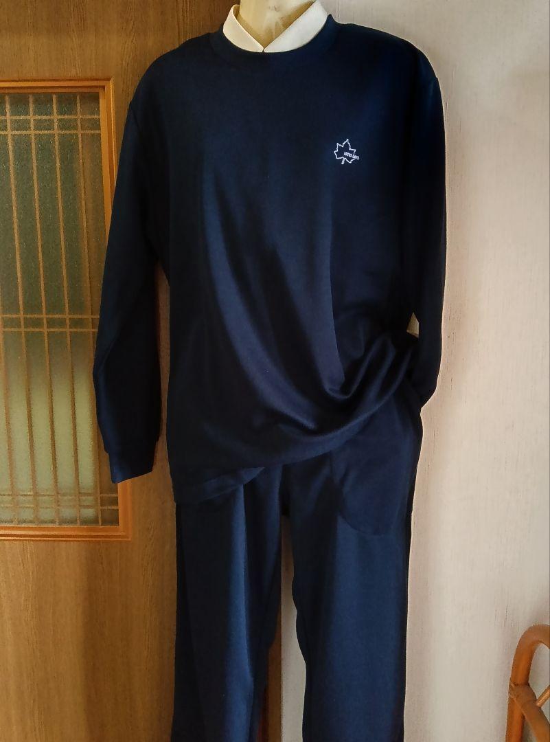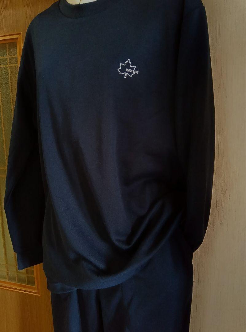 LOGOSのMサイズネイビー上下セット、ロゴ刺繍付き。