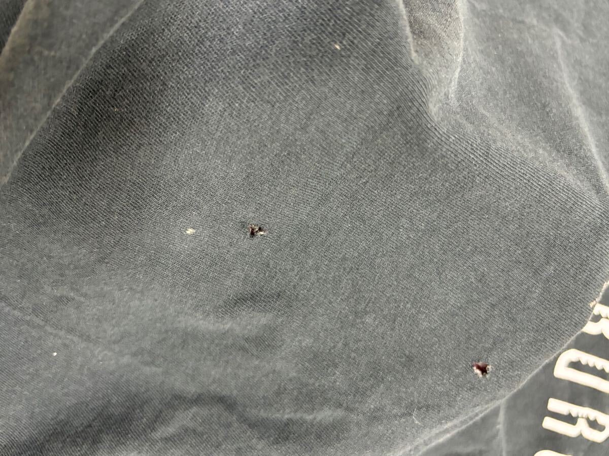 全体的に使用感あり、ブリーチによる点状の色抜け箇所、前面に小穴が二箇所あります。