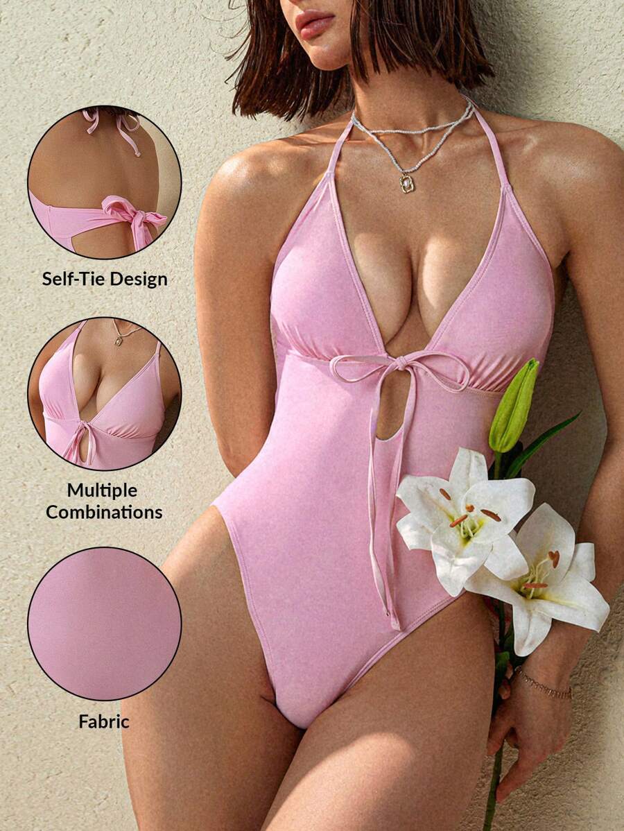 レディース 水着 ワンピース シンプルなスタイルの女性用ピンクのリボンニットのドレープ入りトライアングルカップワンピース水着、ビー