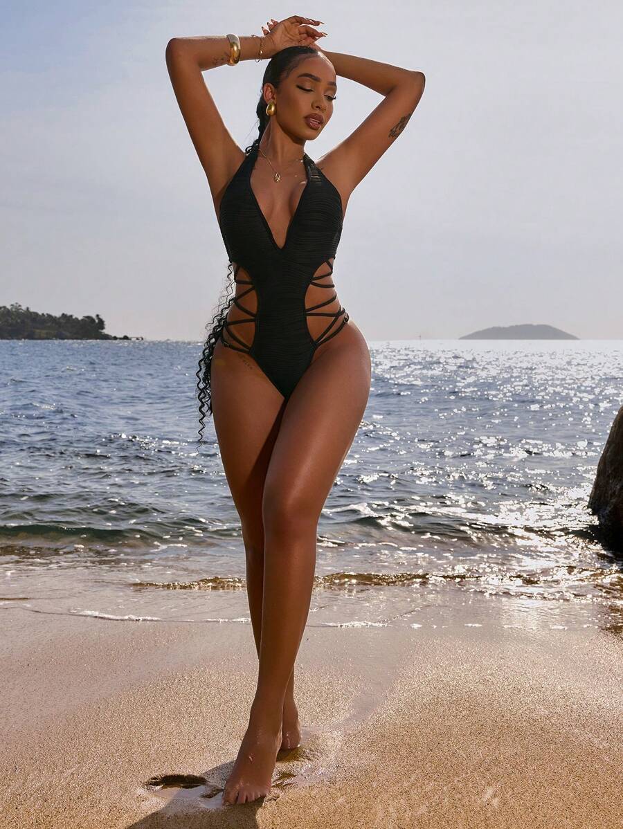 レディース 水着 ワンピース 女性用 黒テクスチャ生地 深めネック ホールアウト ワンピース水着 夏用