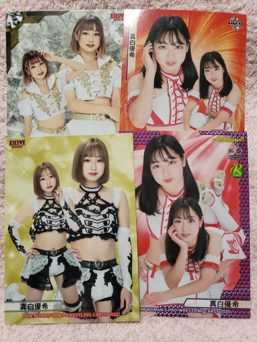 ベースボールマガジン社(BBM社)より発売された女子プロレスカードに封入されておりました真白優希選手のレギュラーカード4枚セットになります。