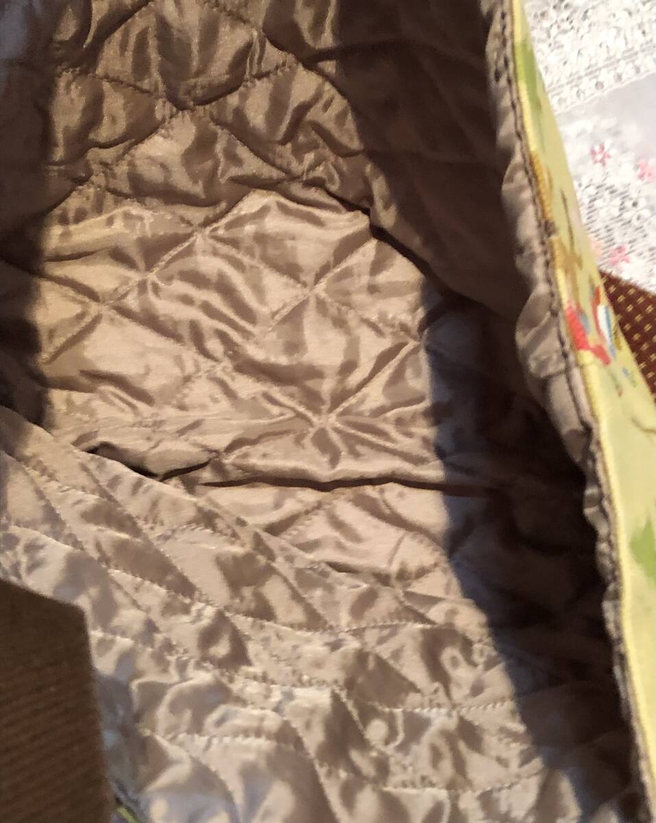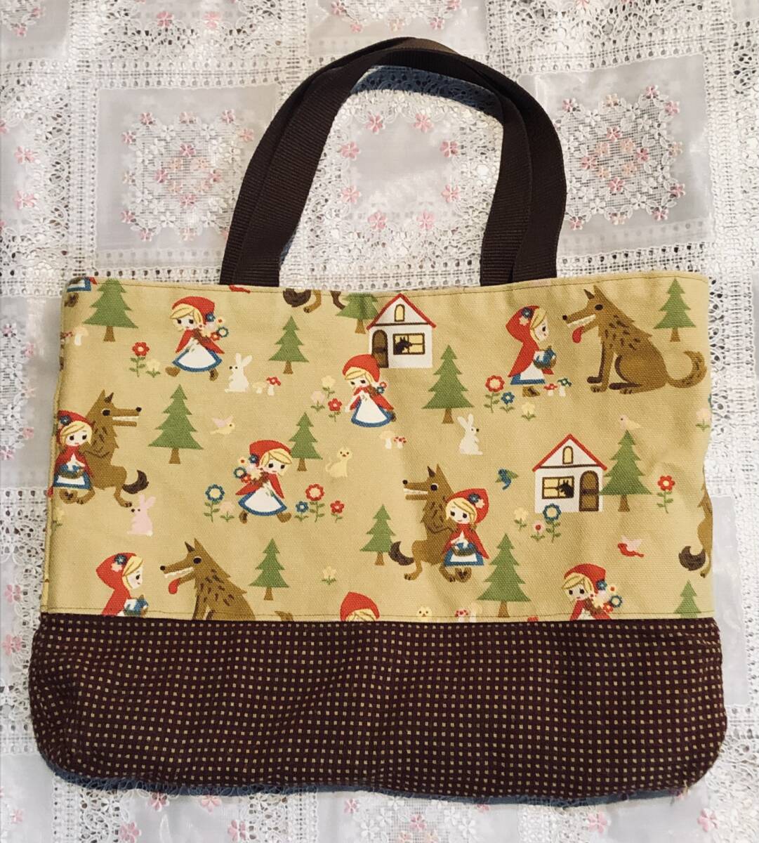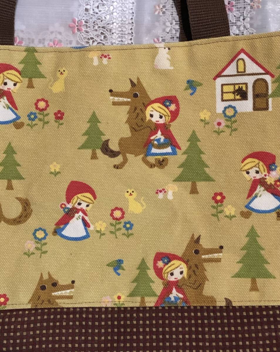 赤ずきんの絵柄が可愛いです。表裏絵柄は同じで2種類の生地です。内側はキルティング生地でしっかり作られてます。