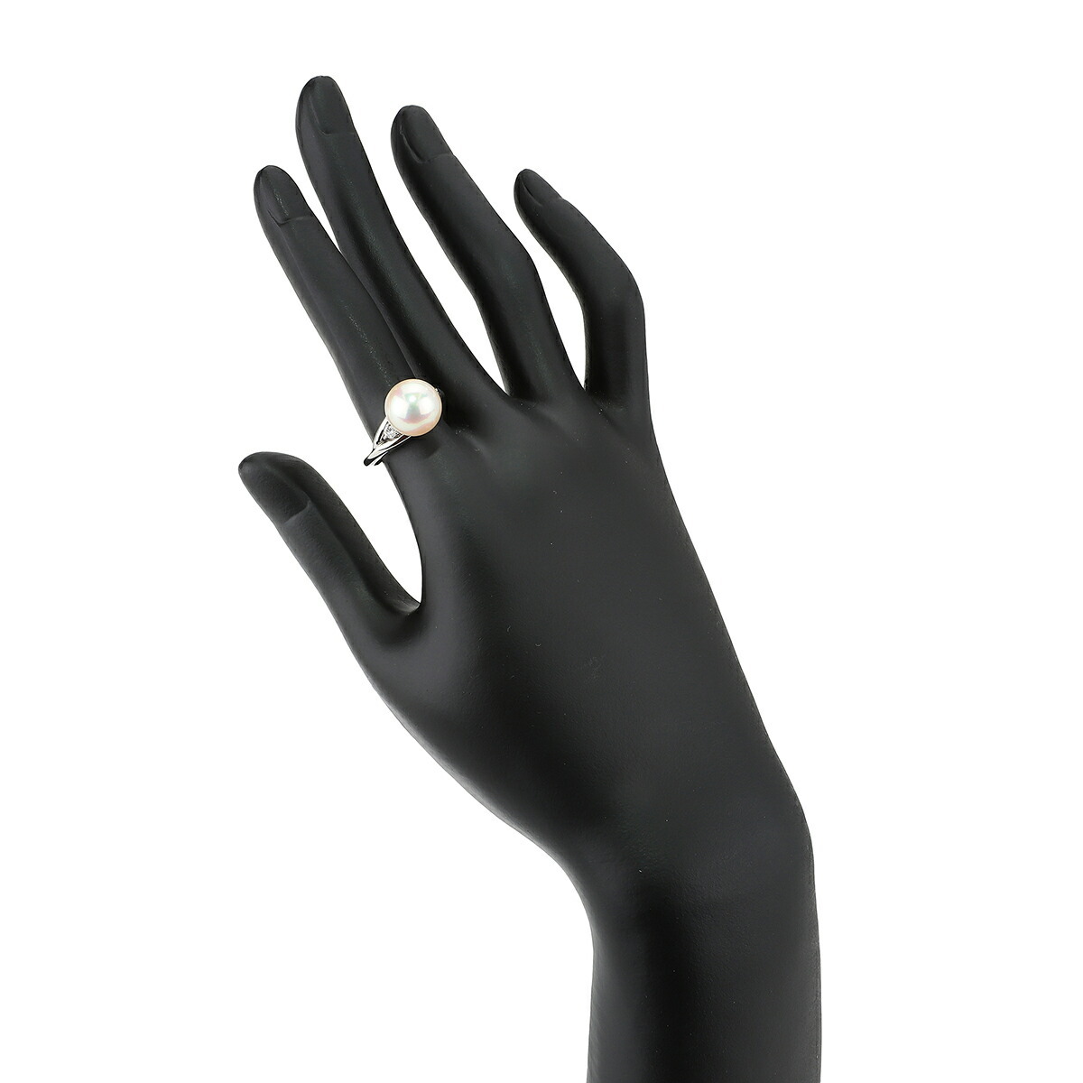 中央には美しい真珠が輝き、その周りの2石のダイヤモンドが優雅さを演出します。上品でありながら存在感のある仕上がりとなっています。
