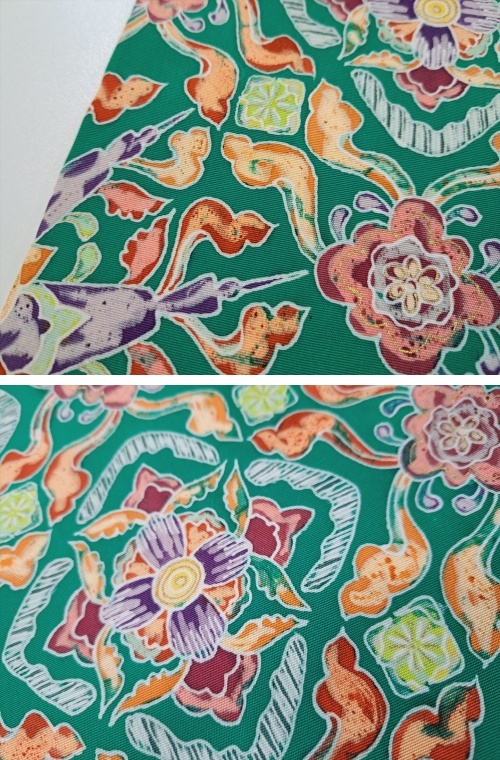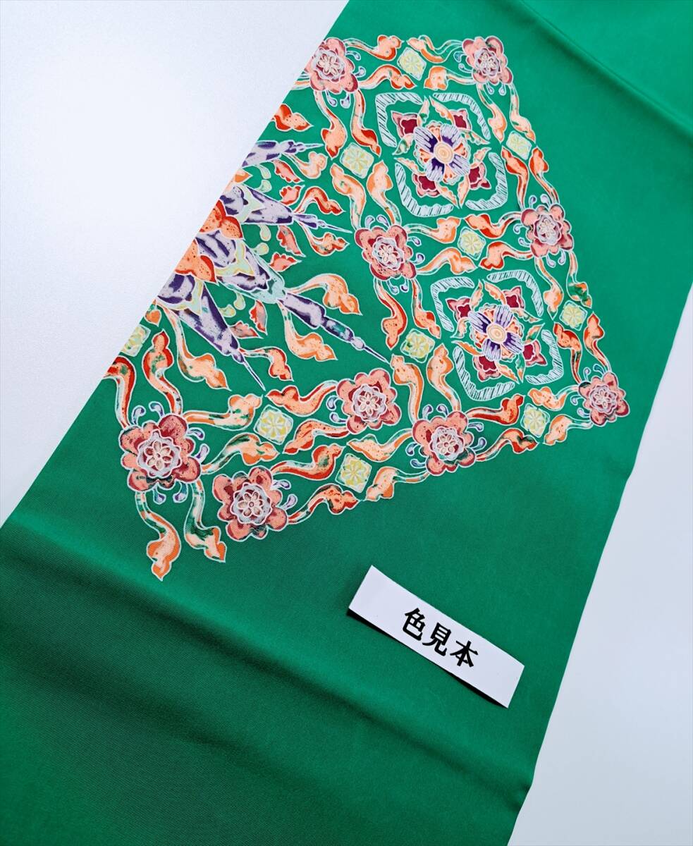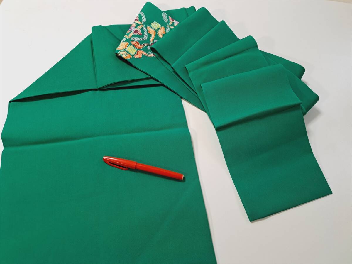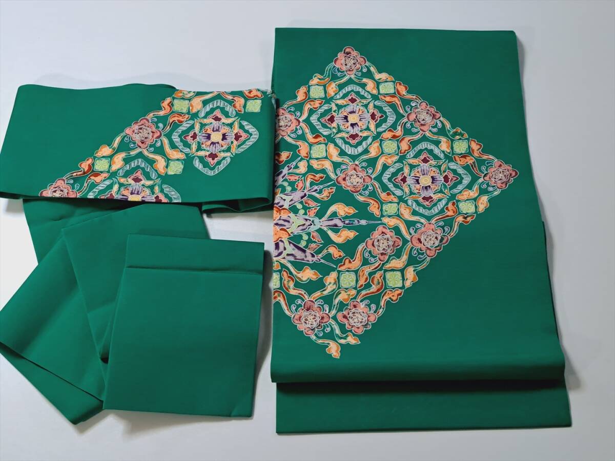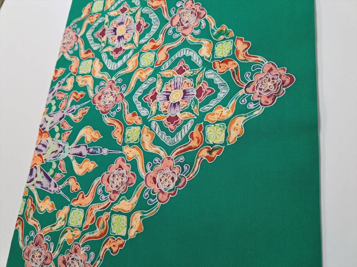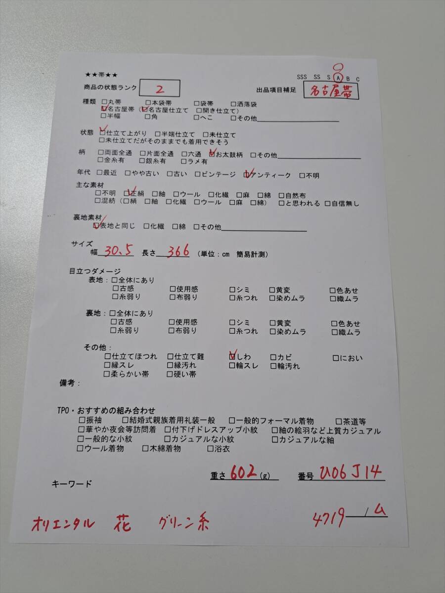 即決■着物の越田■幅30.5長さ366 アンティーク 正絹 名古屋帯 名古屋仕立て お太鼓柄 オリエンタル 花 グリーン系 美品■ひ06J14