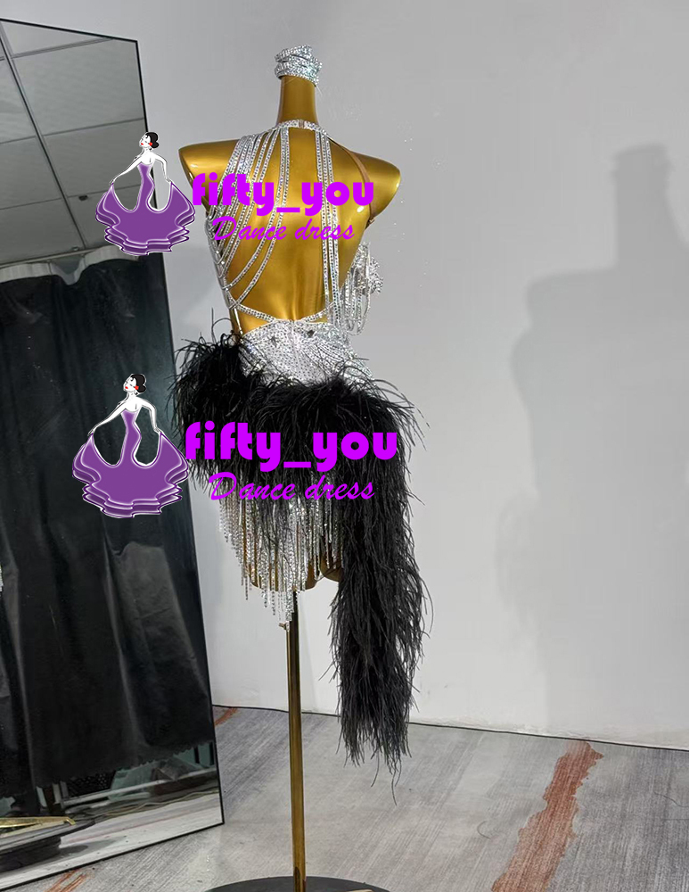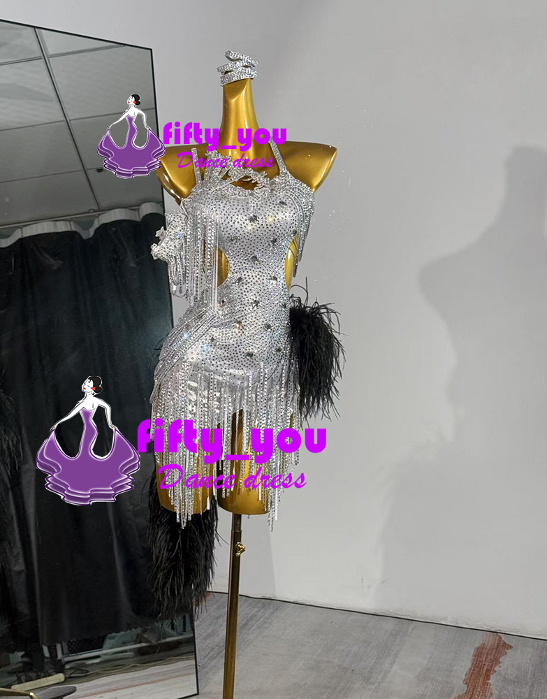 新品fifty_you レディース社交ダンス衣装  ラテン競技デモパーティー用高級ドレス セミオーダー シルバー色 黒い羽飾り