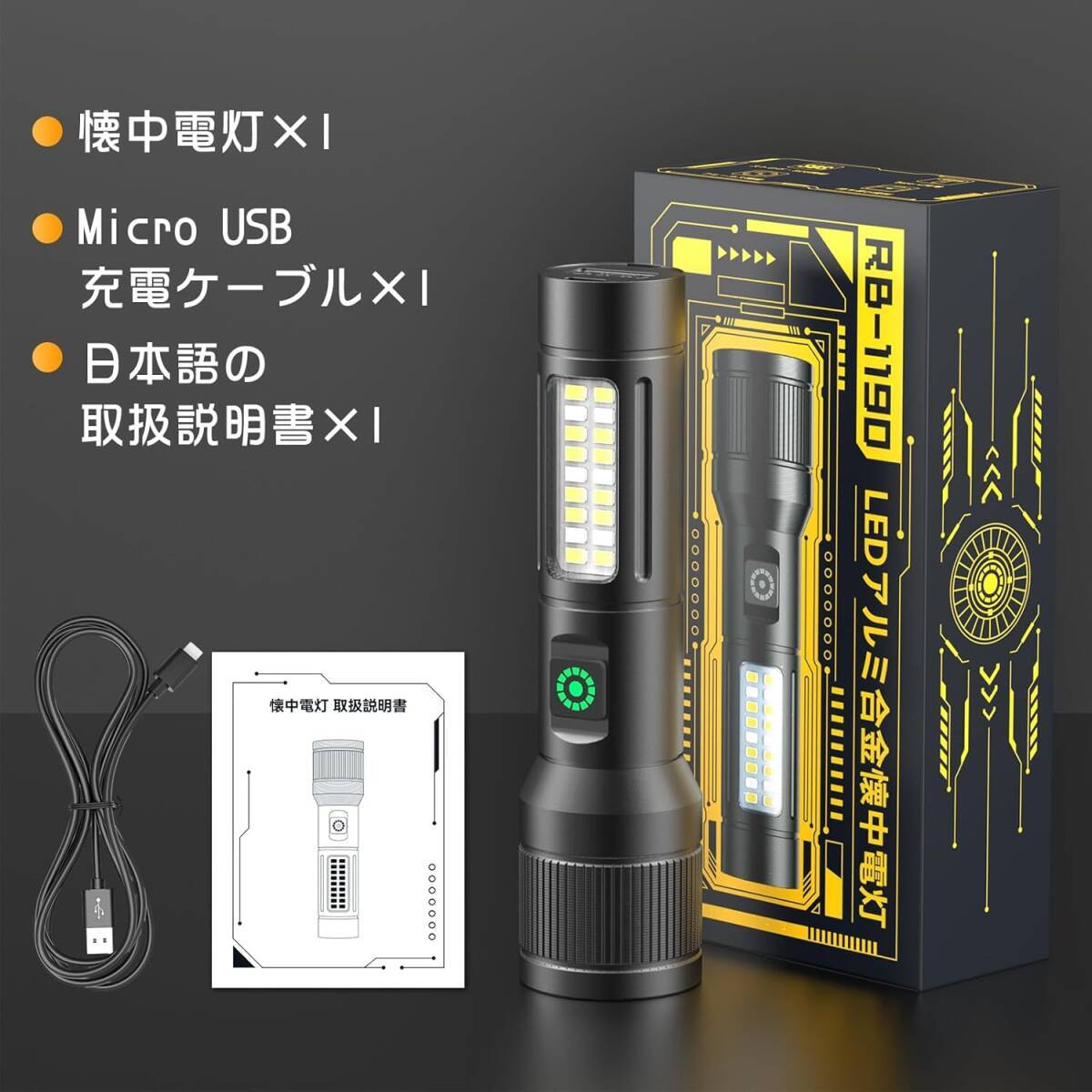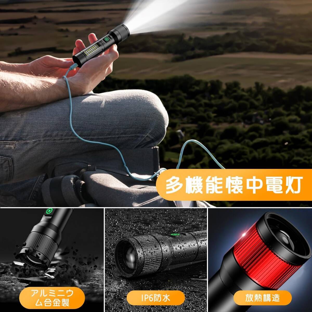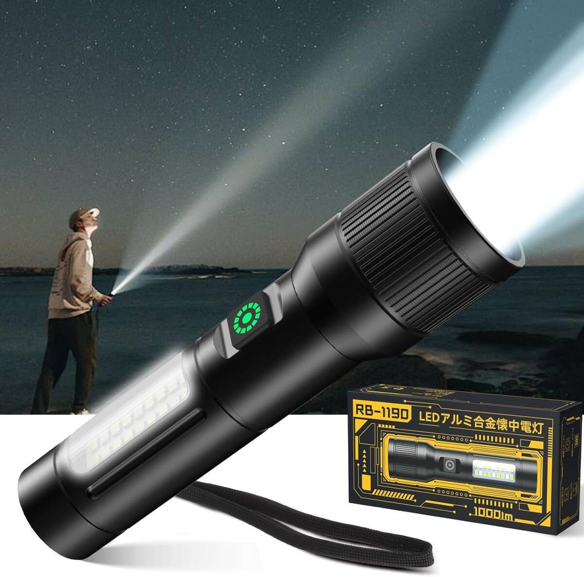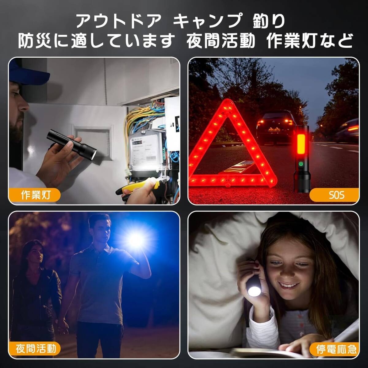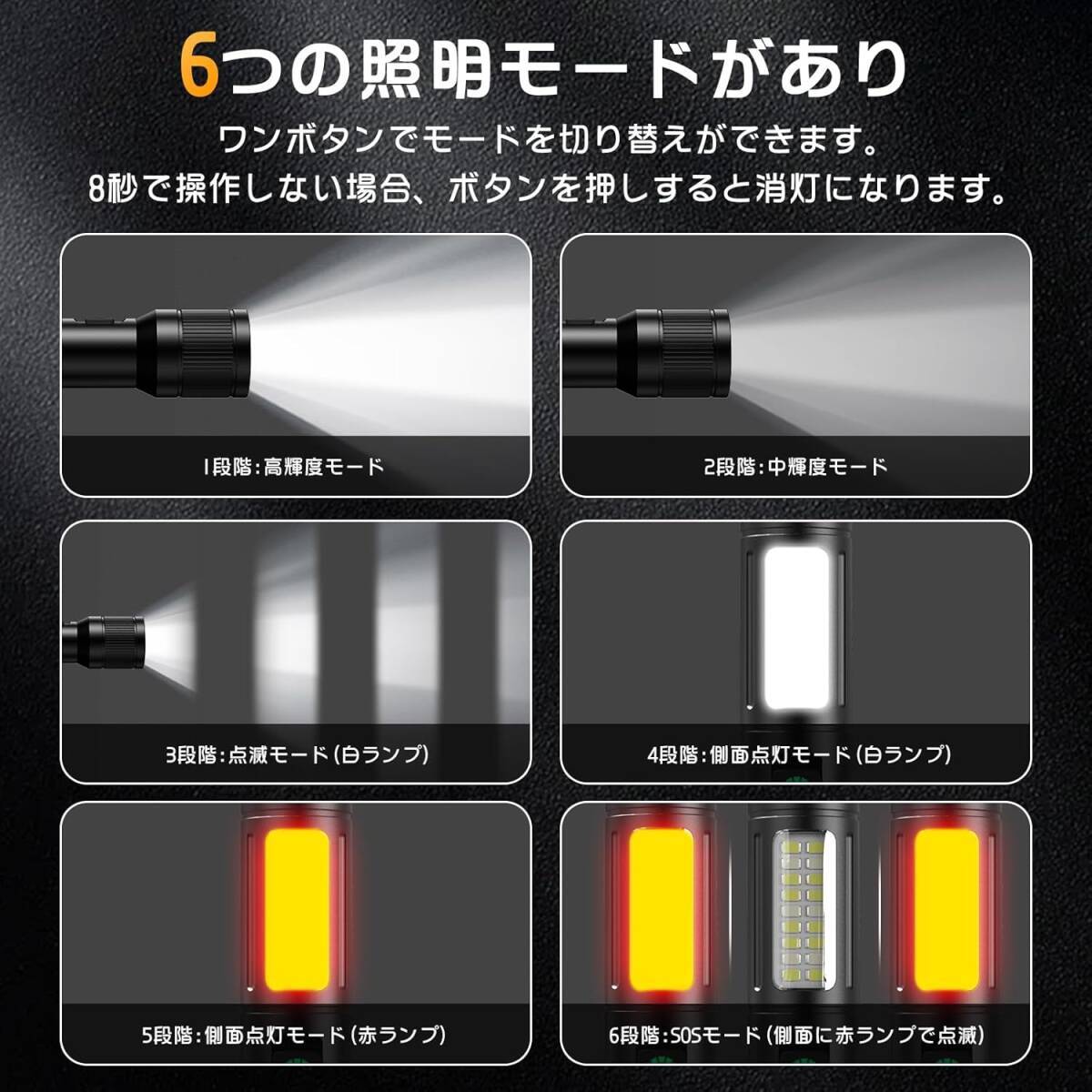 【高強度LED照明で&作業用COBライト&6つの多機能点灯モード】この懐中電灯は,高輝度の LEDを搭載し、最大1000ルーメンの明るさを実現、最大照射距離は500メートルに達します、投射された光束の明るさは完全に同じタイプの懐中電灯を超えて、緊急時にはCOB赤灯の点滅でSOS信号として使用でき、安全性を向上させます。懐中電灯のヘッドを伸縮させることで焦点距離を調整し、遠距離スポットライトまたは広範囲の汎光灯を自由に選択することが可能です。
