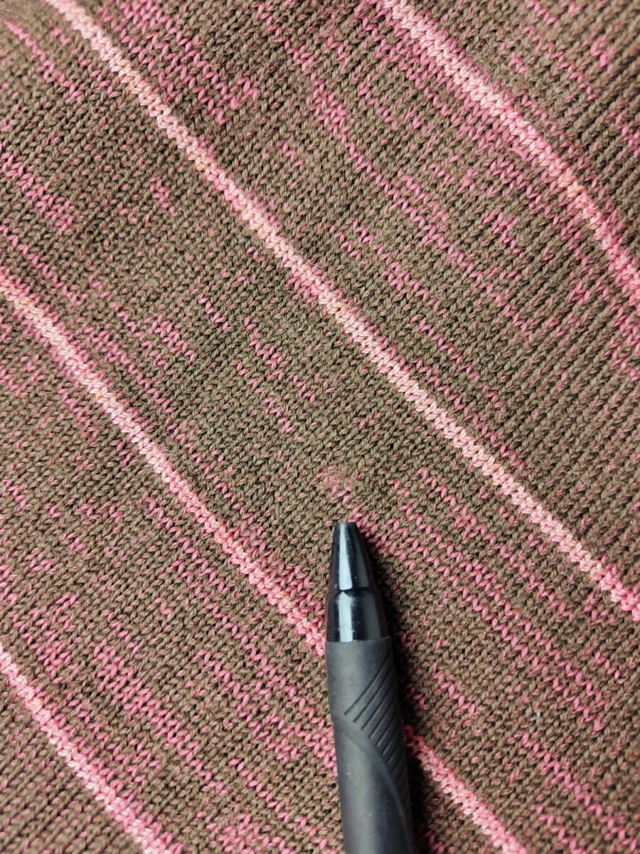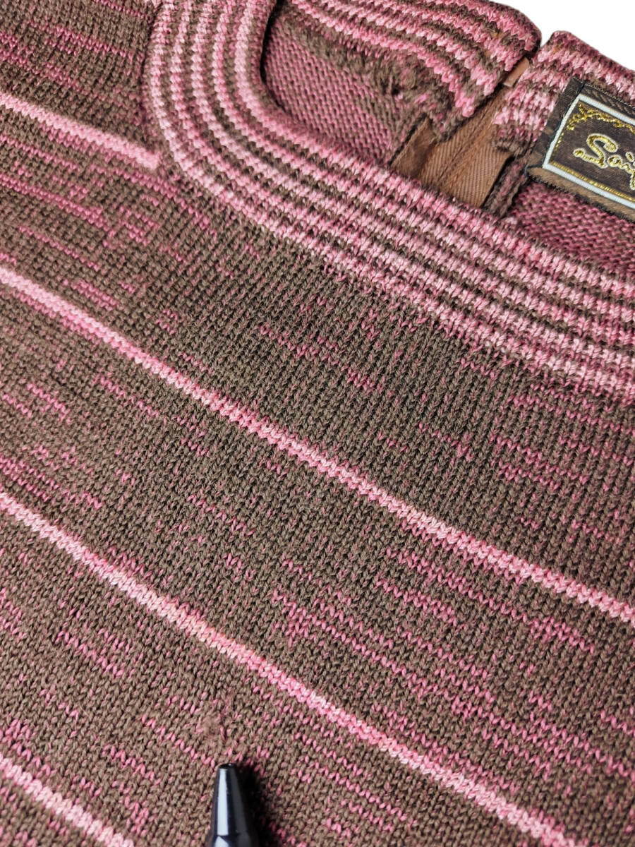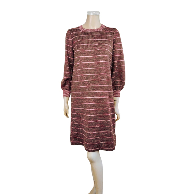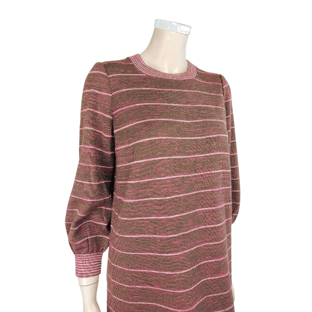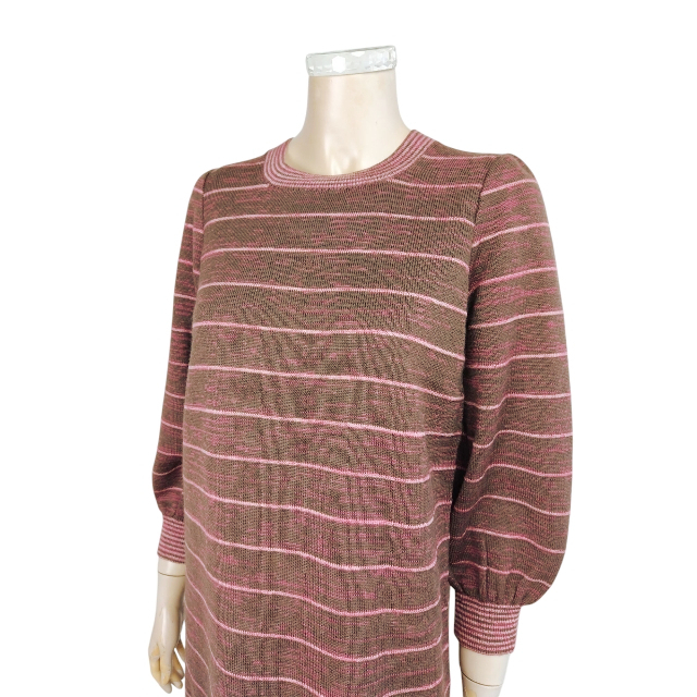 美品★サイトウトヨコ*SAITOTOYOKO*ボーダー柄*パフスリーブ*ココアブラウン系*しなやか優美ニットワンピース*Lサイズ.11号相当