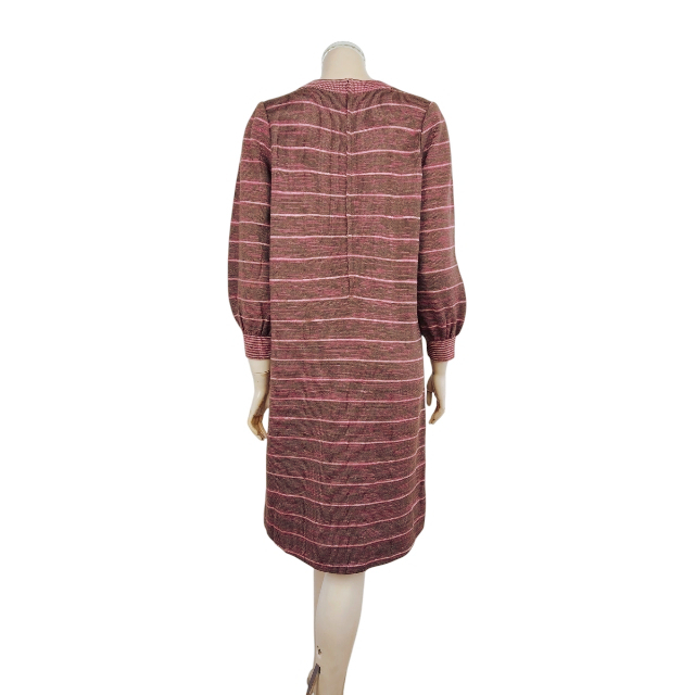 特徴:優しい色合いワンピースです。ココアブラウン系×ラズベリー系のボーダー柄。ふんわりパフスリーブ、ゆったりデザインの優美ワンピースです。 ---↓ここにサイズ記入----
