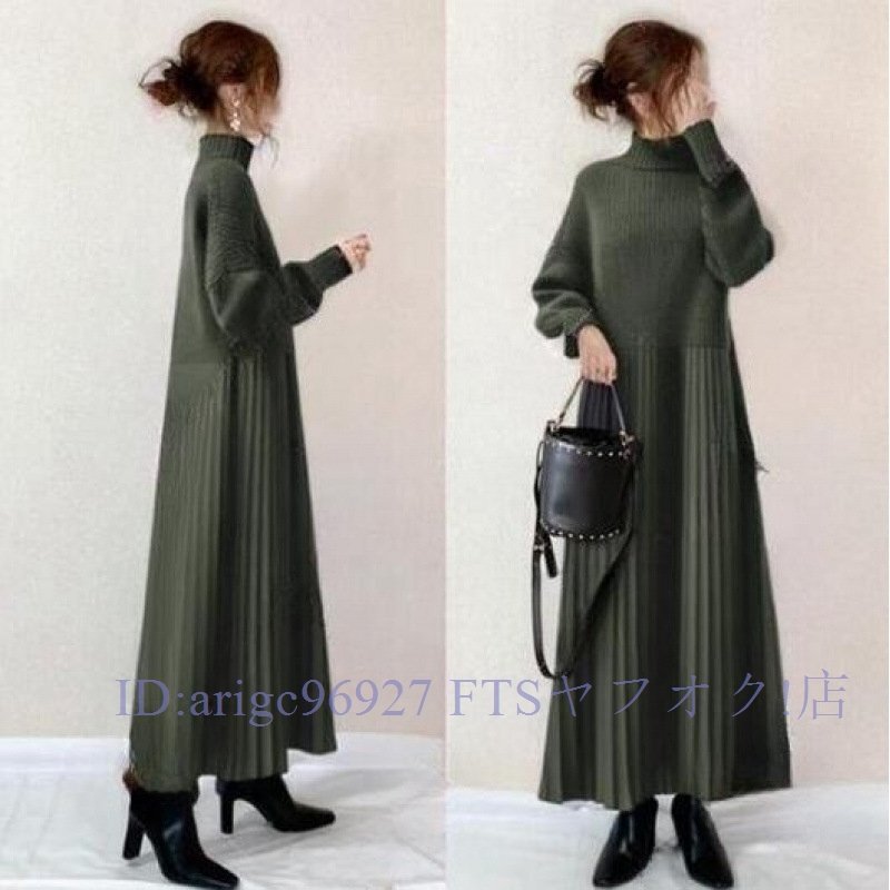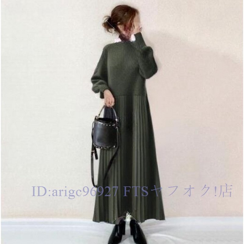B3591☆新品S-Lサイズ ワンピース レディース ニットワンピース ニット切り替え きれいめ 長袖 ロングワンピースグリーン