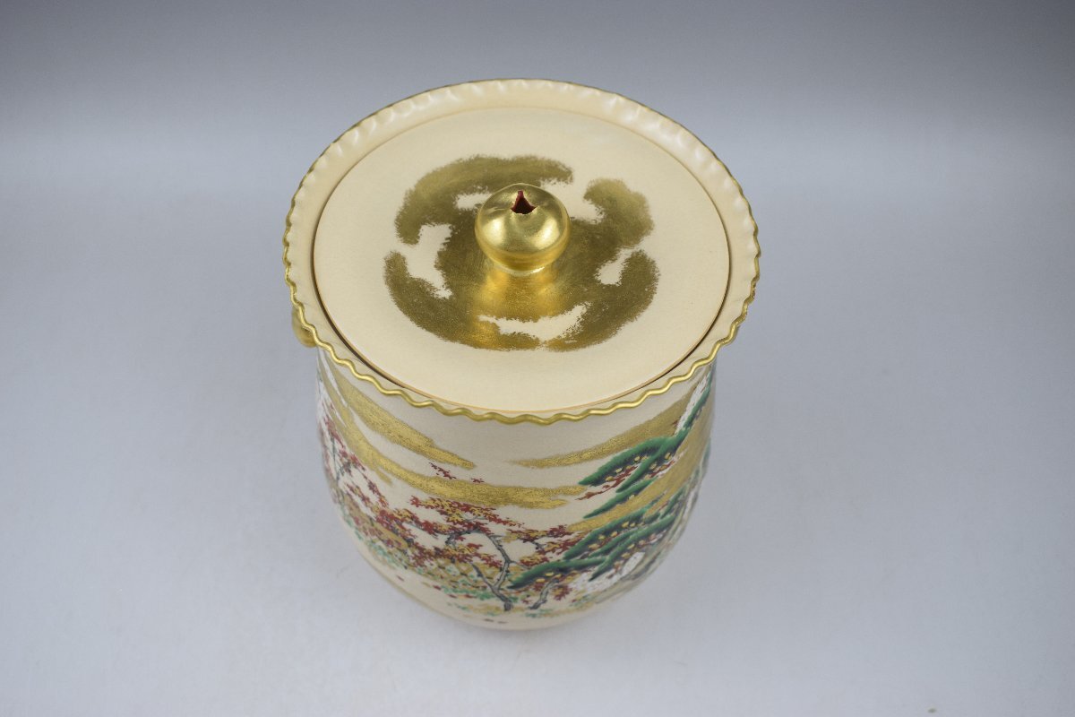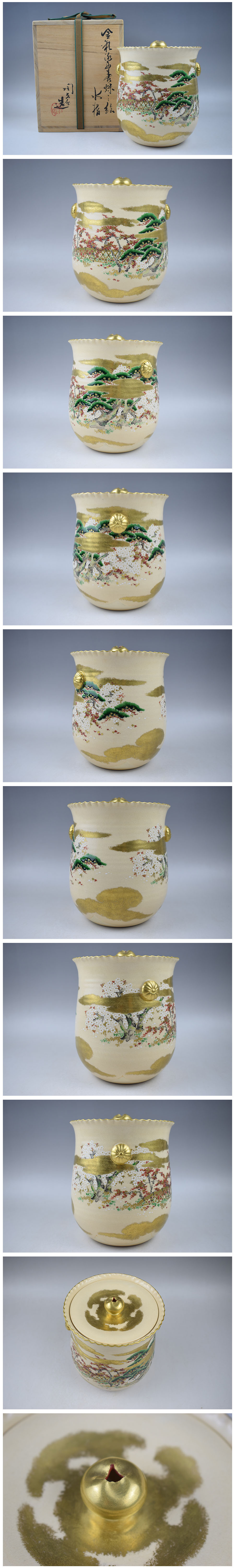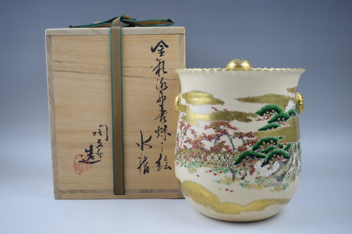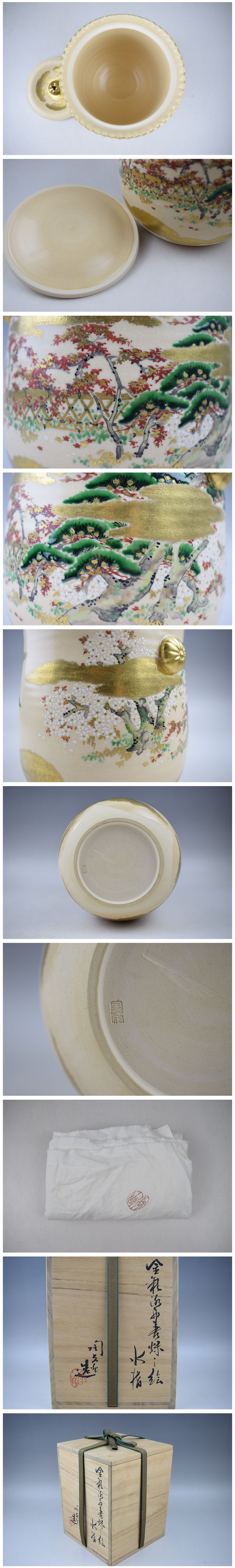 【村田陶苑 金彩流水春秋之絵水指 京焼 茶道具 八塔亭二寧 共箱 真作保証】