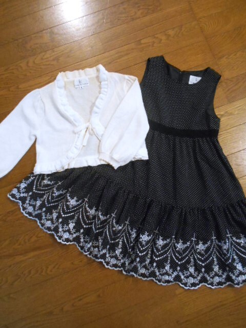 ㈱オンワード樫山 サイズ:M(110-120cm 胸囲:55-61) ◆ボレロジャケット 肩幅:約26cm、脇下辺り:約35cm、袖丈:約33cm、総丈:約29cm *フロントおりぼん1ヶ所 素材:アクリル40%、綿40%、ポリエステル20% ◆ワンピース 肩幅:約23cm、脇下辺り:約33cm、総丈:約61-62cm ウエスト(平置き、二つ置き測定):約32cm *バックジッパー *ポケット2ヶ所 表地素材:ポリエステル100%(刺繍:レーヨン100%/レース部:ナイロン,レーヨン) 裏地素材:ポリエステル お色:オフホワイト(ラメ糸混),ブラックxホワイト ⇒お色の再現は素人のデジカメ撮影では限界が御座いますので、強いこだわりのある方のご入札はどうぞお控え下さいませ。 こちらは委託品に付き購入価格・時期及び保管期間・状態は不明です。 ⇒保管臭、保管皺があります あくまでも自宅保管のユーズド品です。当方ではクリーニング等のメンテナンスは行っておりません。 お気に召さない香りや保管臭、保管皴、(室内暖色系電灯での確認に付)目の届きにくい場所の汚れ・しみ・擦過傷等の見落としがある場合があります。 何卒ご理解の上ご入札下さいませ。 返品は承っておりませんので、予めご了承下さいませ。 ご落札後のご連絡・ご入力開始は48時間以内、ご決済は5日以内にお願い致します。 それではどうぞ宜しくご検討下さいませ。 !)普通郵便:定形外発送をご選択の場合、搬送時の紛失及び破損等につきましては補償致しかねます。又、土日祝配達なし、残業軽減等の事情により、以前よりお届けまでに時間がかかっている様です。予めご了承下さいませ。 !)サイズダウンの為、圧縮梱包させて頂きます | |||
