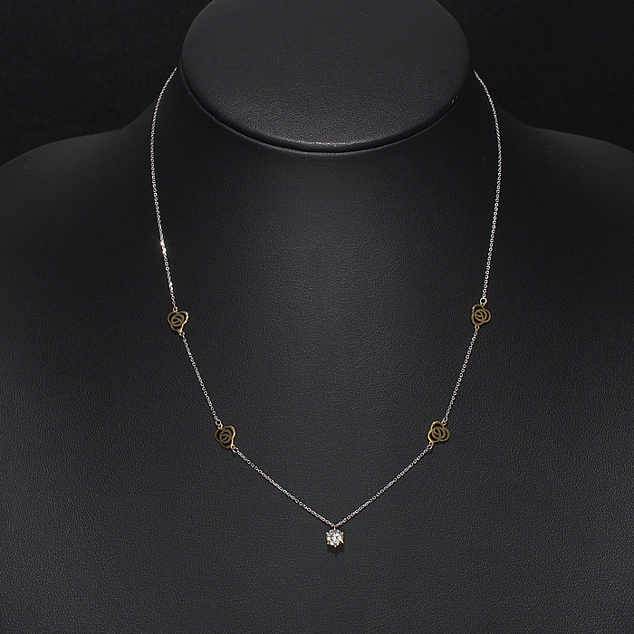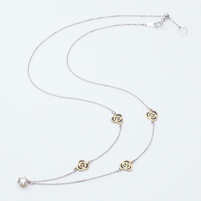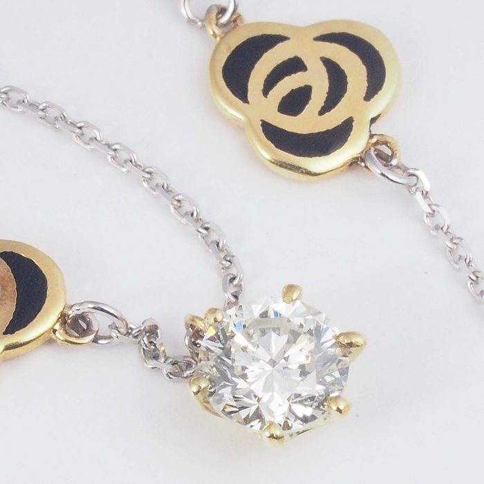 フラワーデザインと1粒ダイヤをあしらったネックレスです。チェーンはスライドアジャスター付きでお好みの長さに調節可能です。