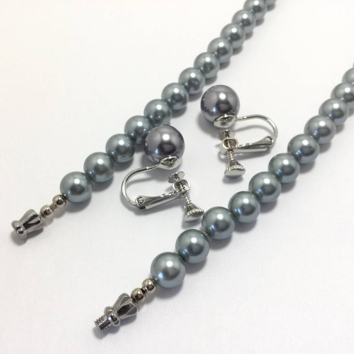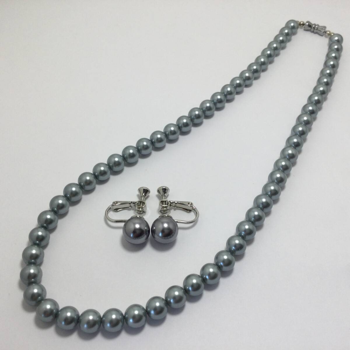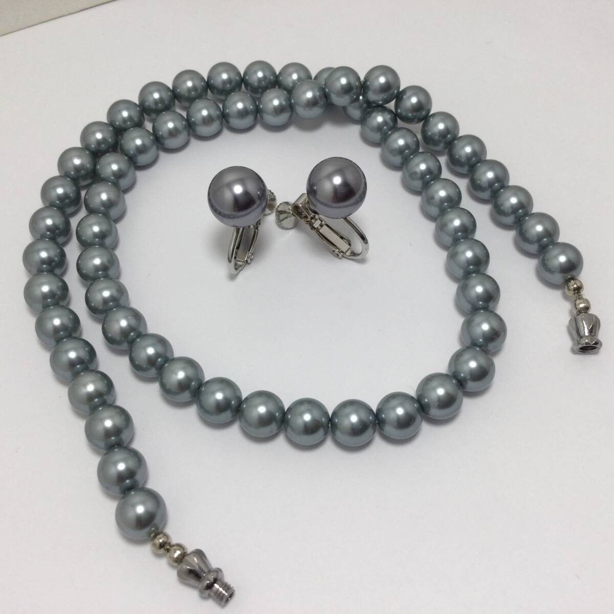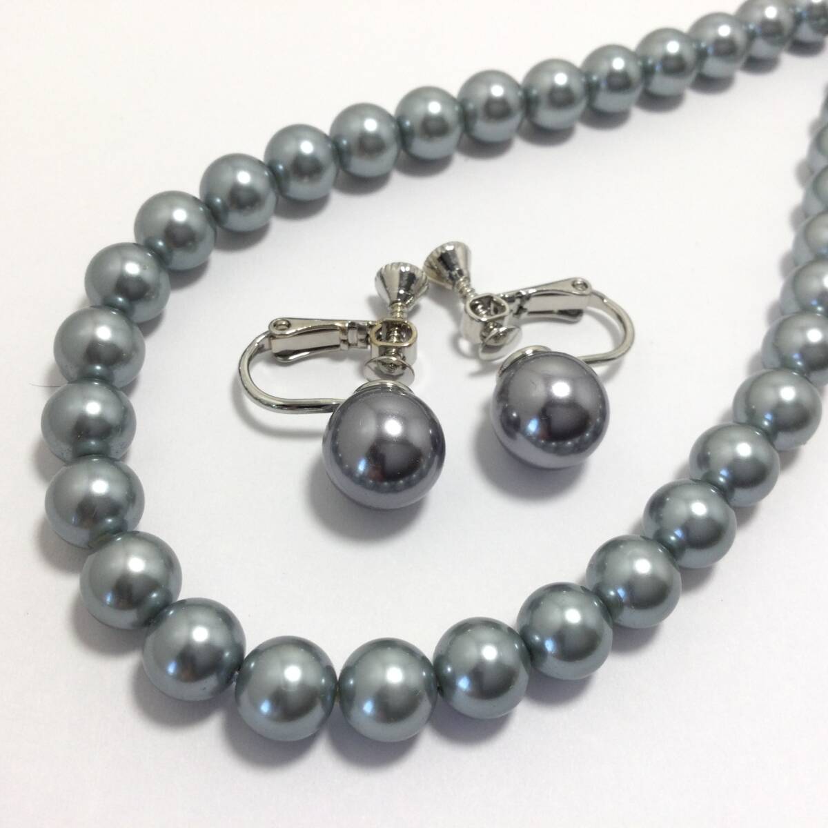 ①エレガントなデザイン:上品なグレーパール風ネックレスイヤリングで洗練された印象に。