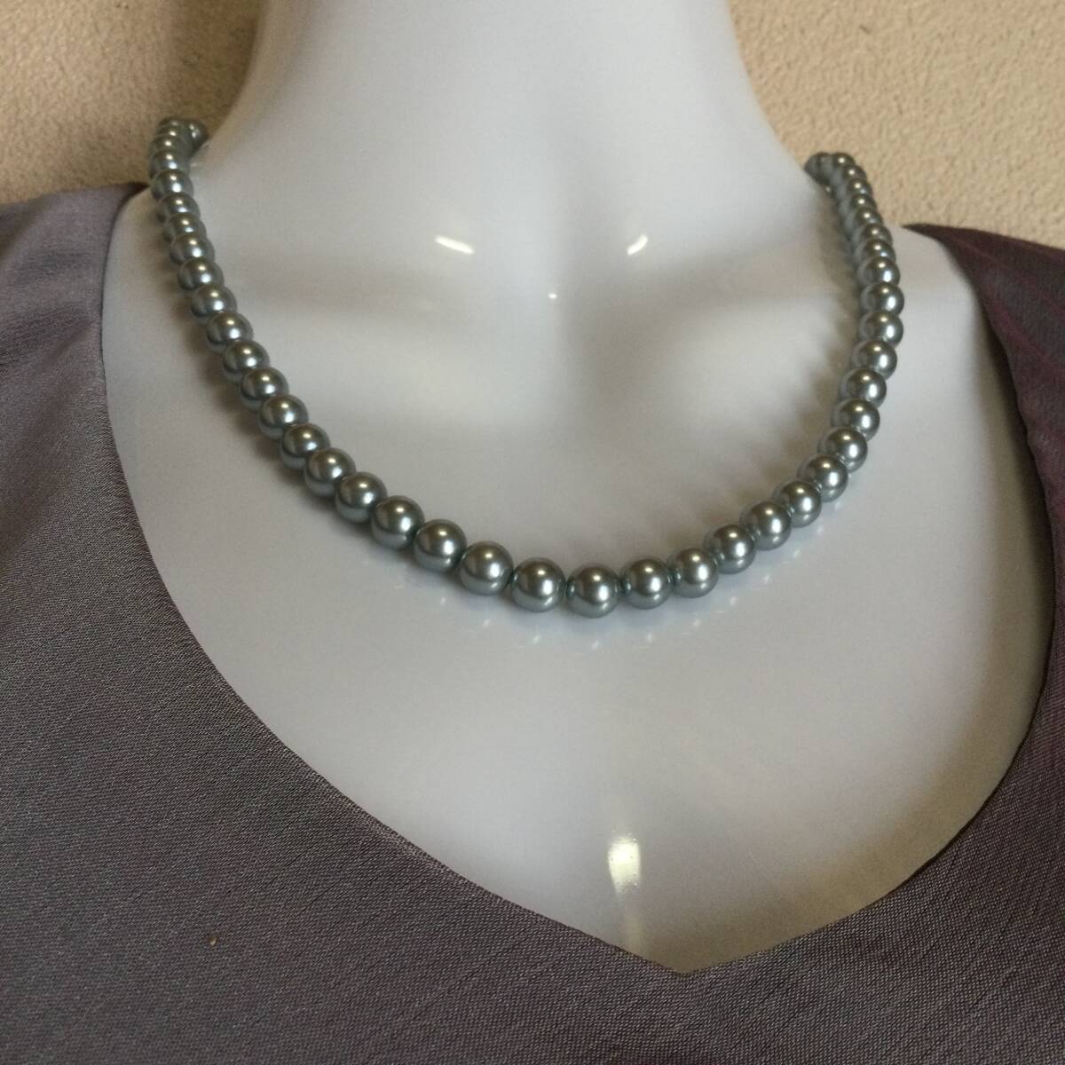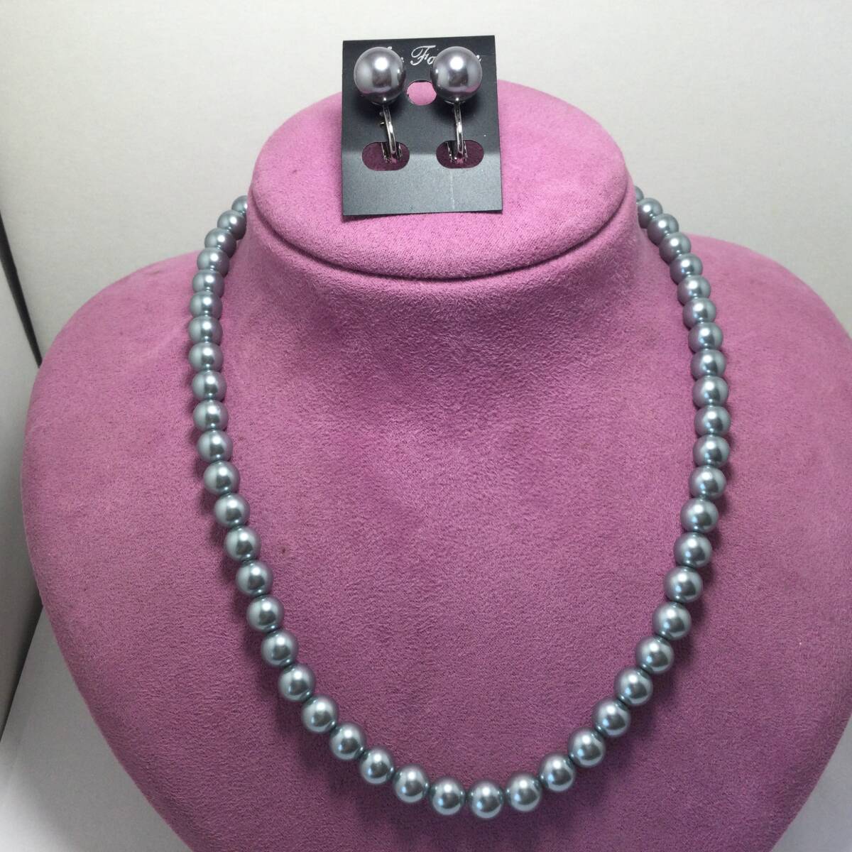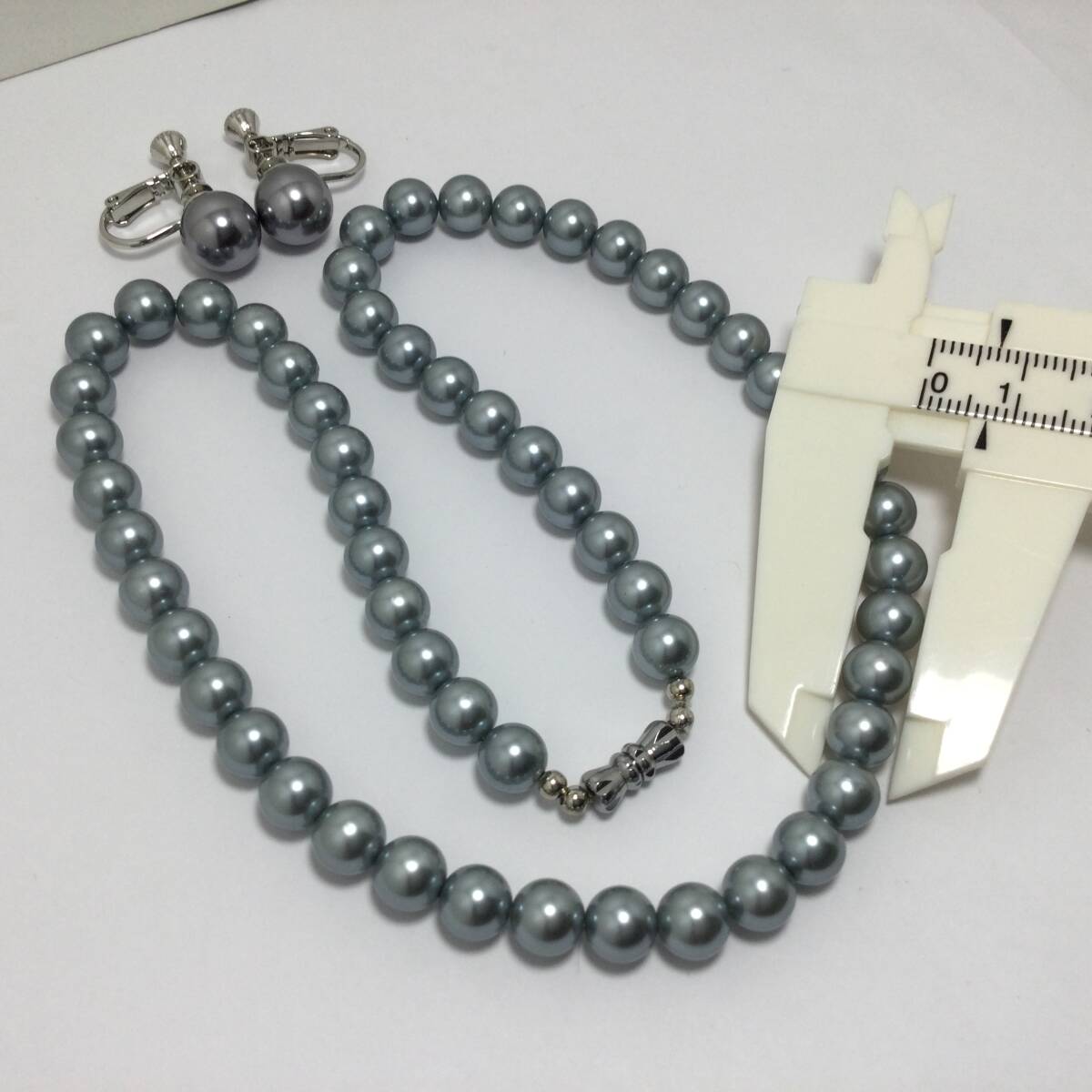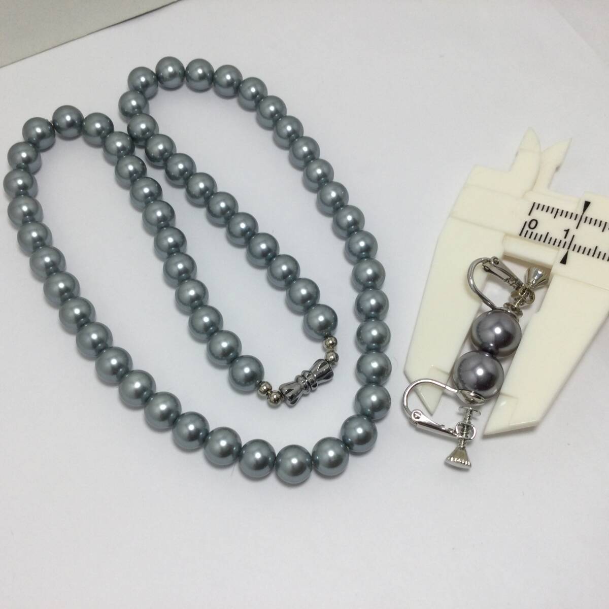 ①エレガントなデザイン:上品なグレーパール風ネックレスイヤリングで洗練された印象に。
