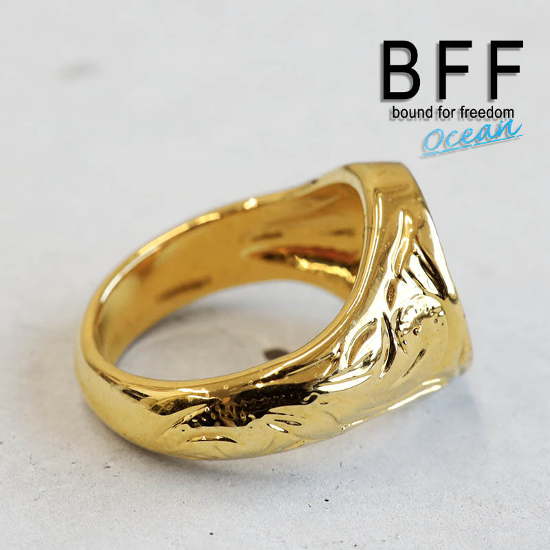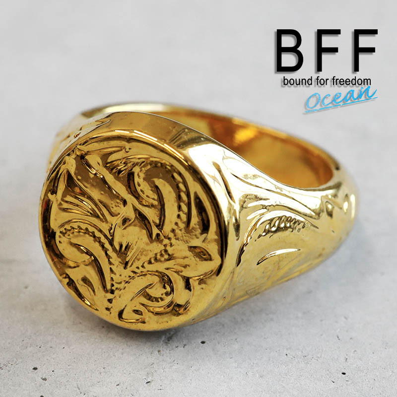 印台にハワイアンのデザインを取り入れた珍しいリング。シンプルで存在感のある丸型の印台に流れるようなスクロールとハワイでは神聖な葉として知られるマイレをレリーフ。