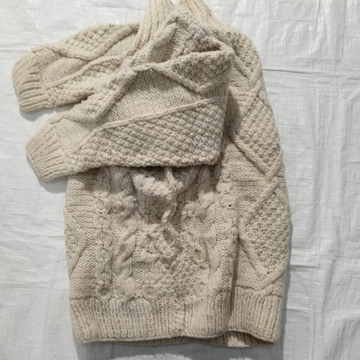記載ありませんが手編みで リブと本体 脇部など 縫製がつながっています。