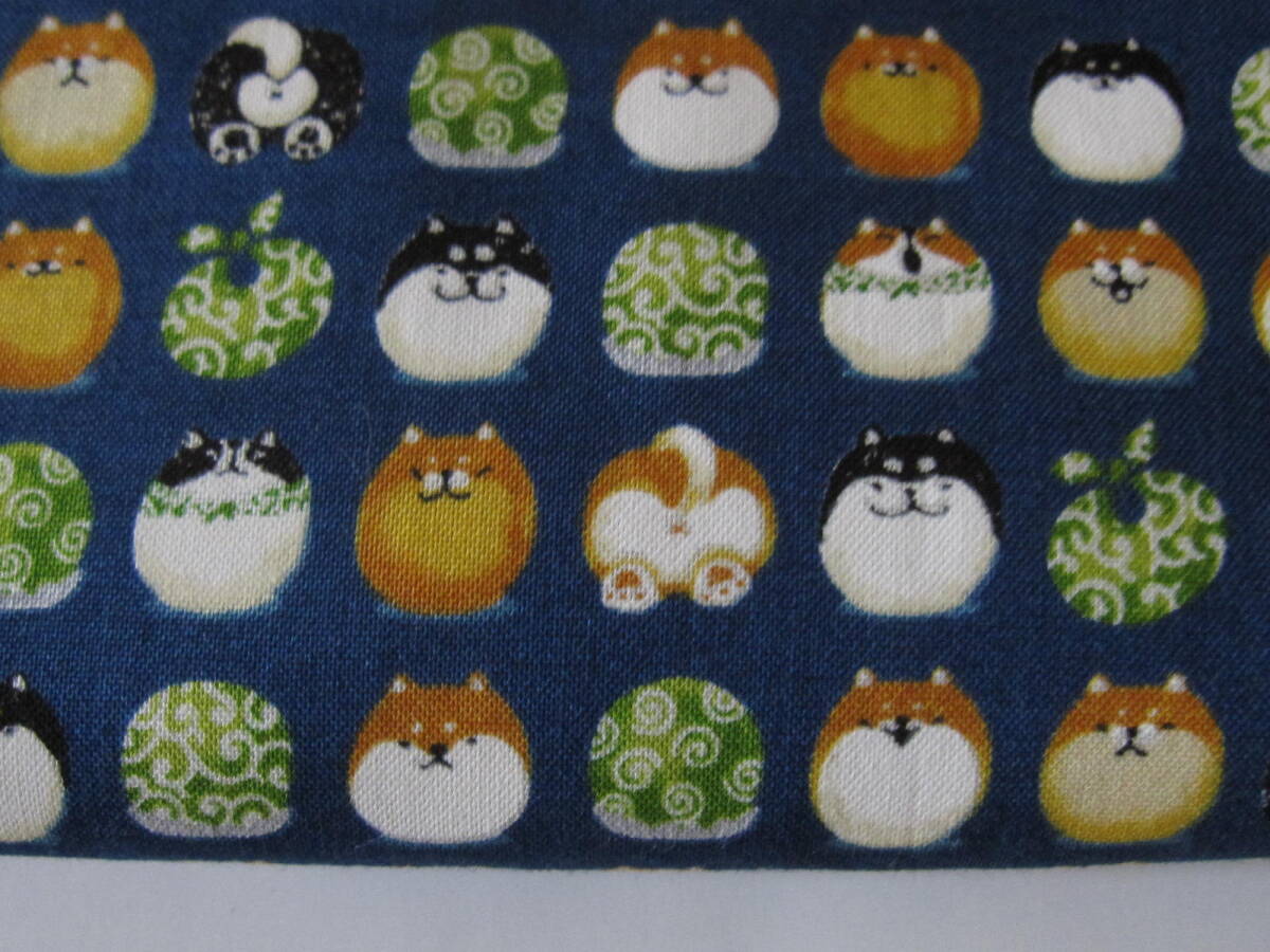 絵柄は、濃い紺色の地に、柴犬×まんじゅう柄