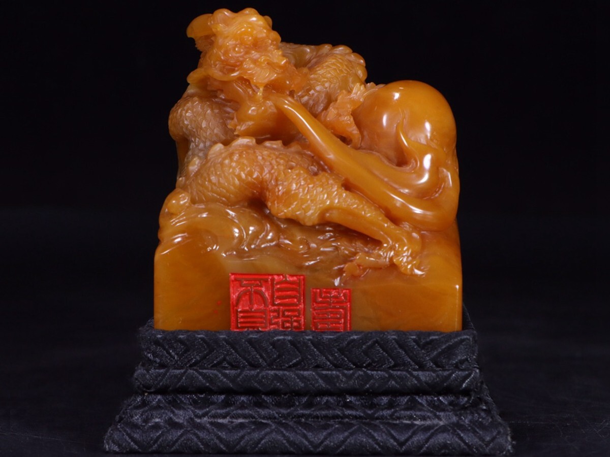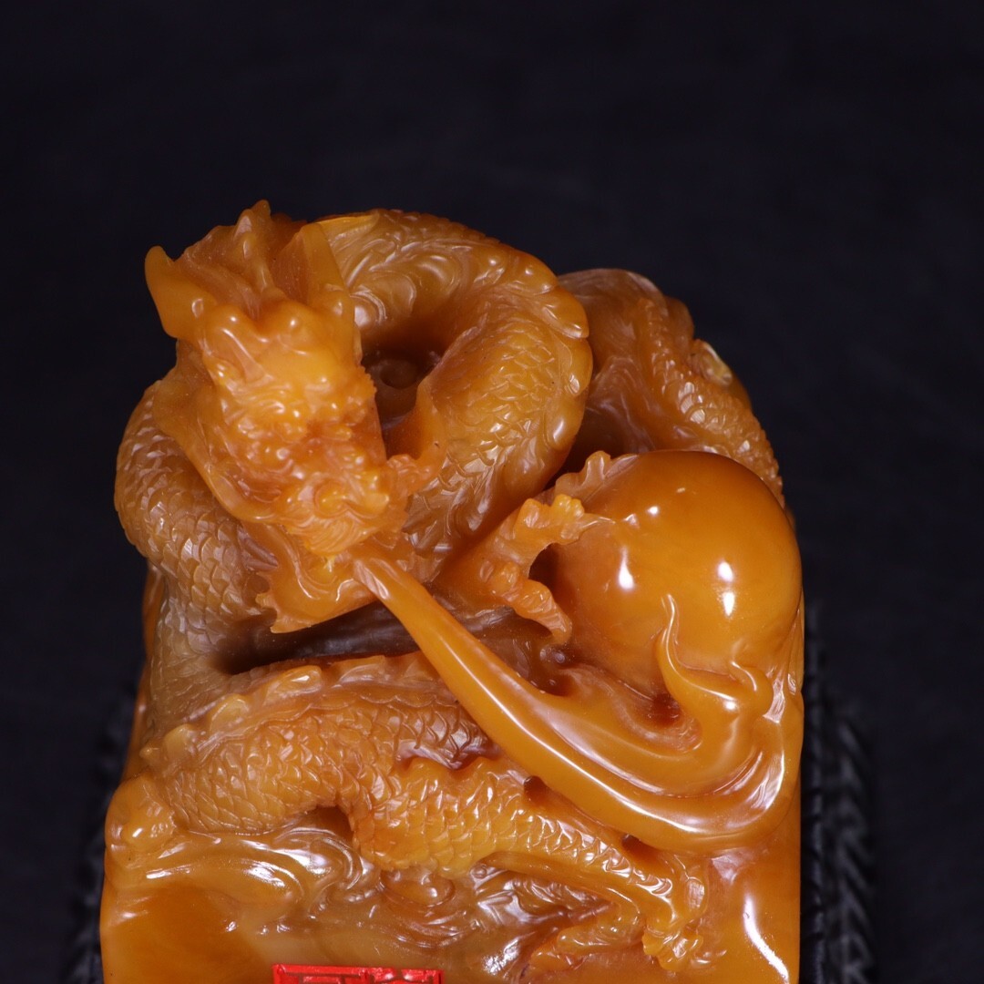 【瓏】寿山石 田黄石彫 祥龍吐珠鈕大印章 清代 古泥作 極細工 手彫り 置物擺件 中国古賞物 古美術 蔵出