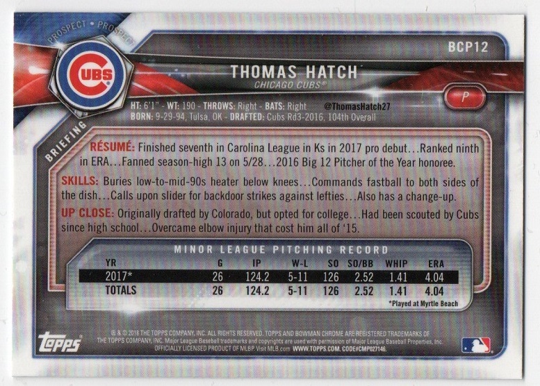 2018 Bowman Chrome Prospects #BCP12 Thomas Hatch