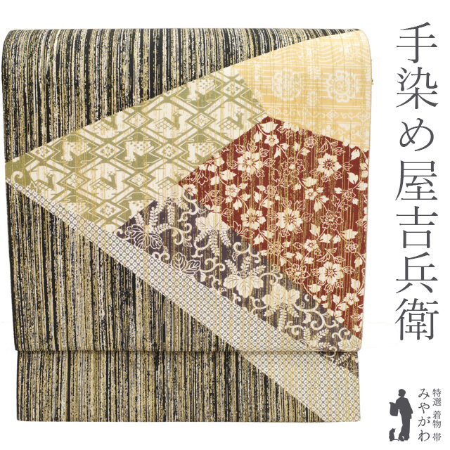 袋帯 リサイクル 全通 正絹 手染屋吉兵衛 縞 切りばめ柄 花 志毛引染 しけ引き 金彩加工 カジュアル 中古 仕立て上がり みやがわ sb53369