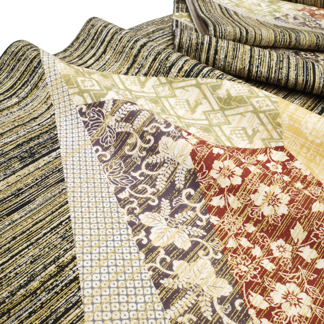 こちらのお品は、黒地に切りばめ風の花・立涌・桐・有栖川文などの柄行と、その上から金彩加工で細縞が染められたデザインです。