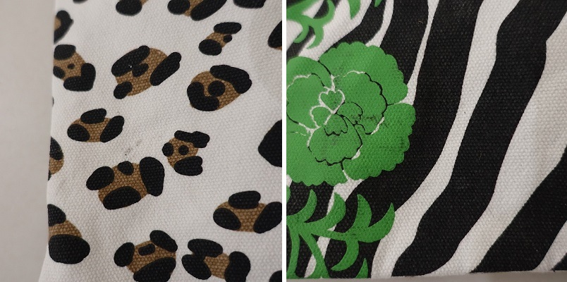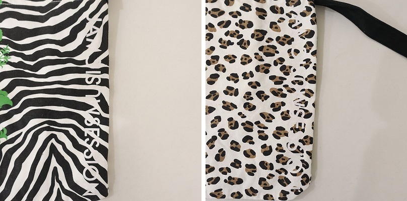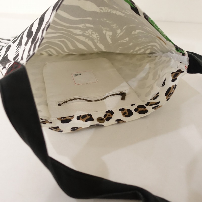 N.Jamのキャンバススモールバッグです。カラーはホワイトベースで片側はレオパード柄、片側はゼブラ柄にグリーンのフラワープリントが施されております。開口はスナップボタン留めで、内側にファスナーポケットが1個ございます。 |