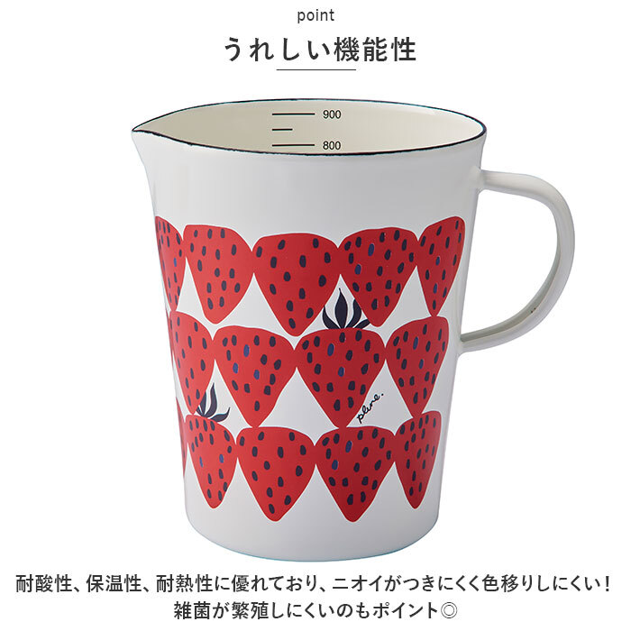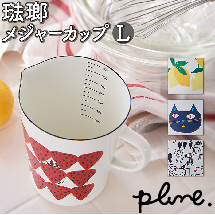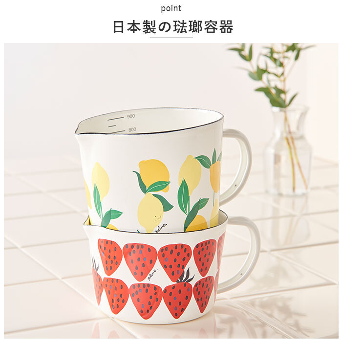 | 商品説明 | ・・ポップで可愛いデザインが魅力♪Pluneのホーローメジャーカップ(Lサイズ)が登場。 ・【日本製の琺瑯容器】 ・新潟県燕市で1つ1つ丁寧に仕上げたメジャーカップ。(※下地は中国国内、絵付け、仕上げまでの完成工程を日本国内で行っております。) ・【うれしい機能性】 ・耐酸性、保温性、耐熱性に優れており、ニオイがつきにくく色移りしにくい!雑菌が繁殖しにくいのもポイント◎ ・【毎日のお料理で大活躍】 ・満水容量930ml。内側に300ml~900mlまで50mlごとに確認できる目盛りが付いているから、計量がラクラク! ・【取っ手付き】 ・サッと取り出せて、汁物を注ぐ際にも便利! ・【ギフトにも♪】 ・キッチンの雰囲気が明るくなる、おしゃれなデザインをラインナップ!お料理好きな方へのプレゼントにもおすすめ。 |