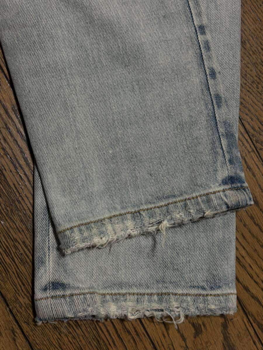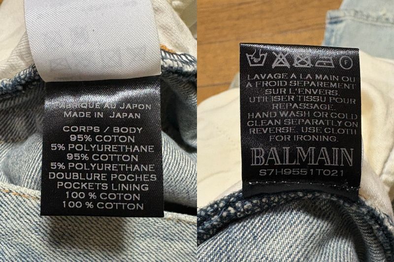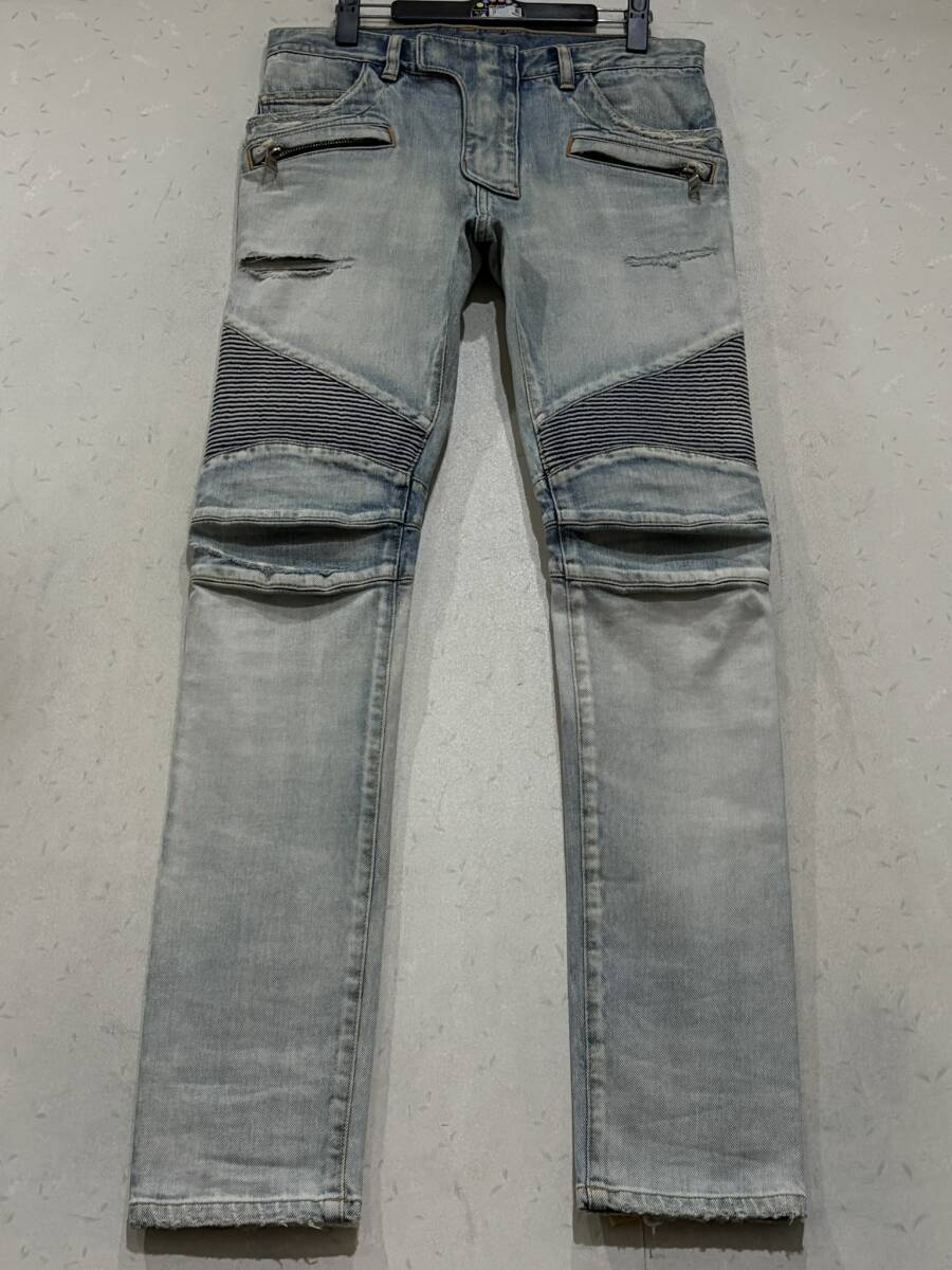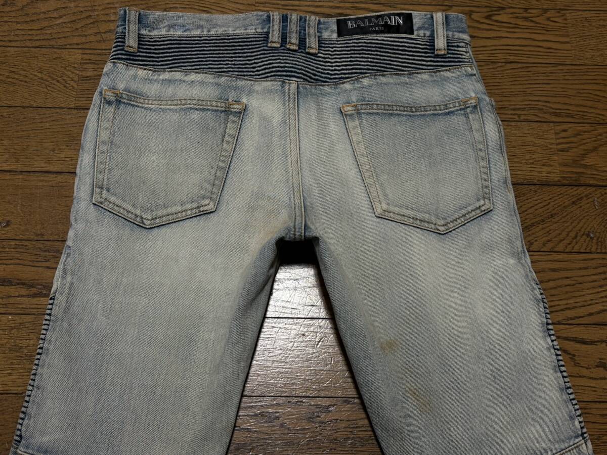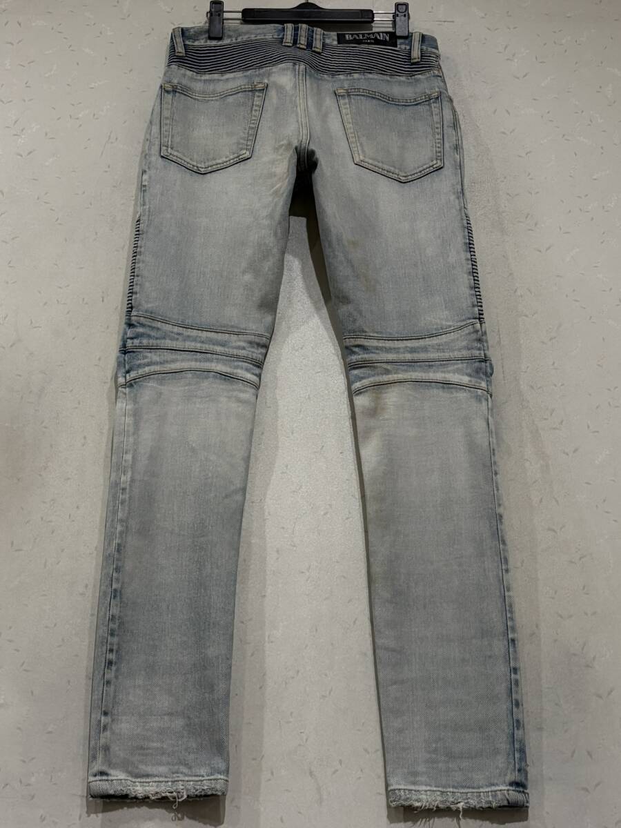 BALMAIN バルマン バイカー 蛇腹 S7H9551T021 ダメージ&汚れ加工 ストレッチ デニムパンツ ブルーベルタグ ライトインディゴ 未裾直 日本製 28                        BJBE.A