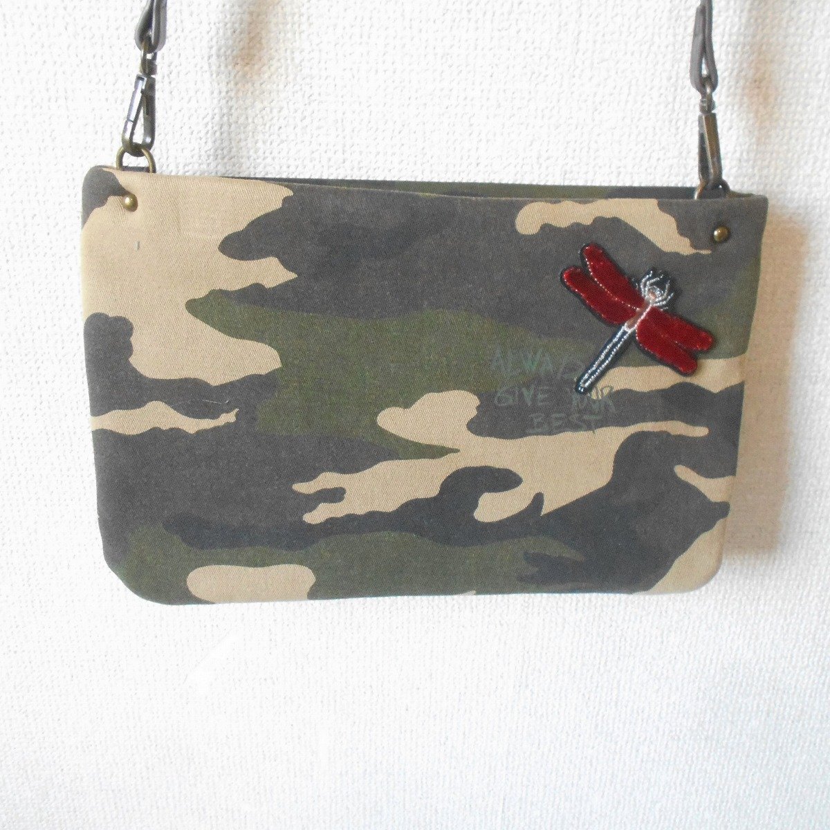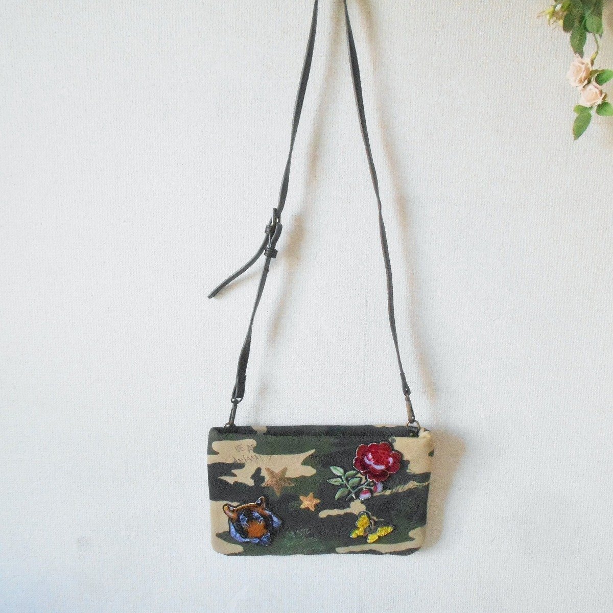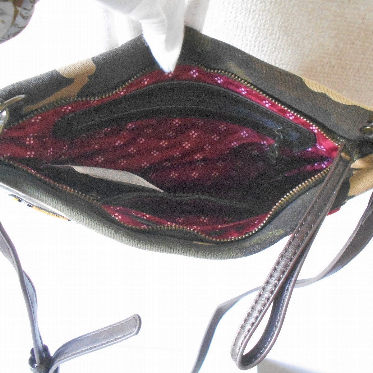 【ポイント】デジグアルのバッグになります。お色はカーキ系のカモフラージュベースで、蝶々やお花やトンボ等が付いた、とっても素敵なデザインです。