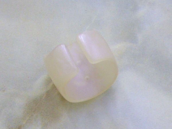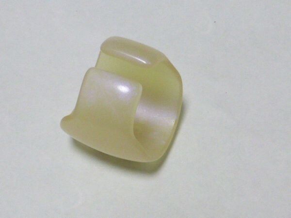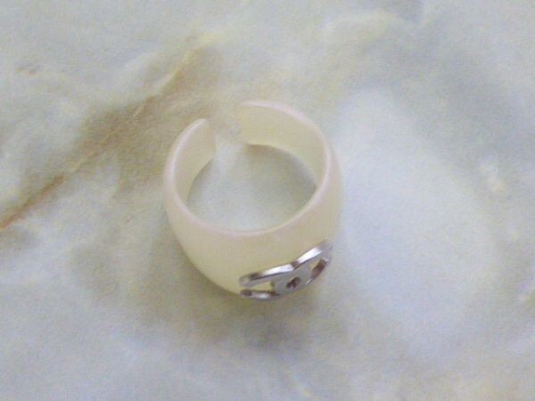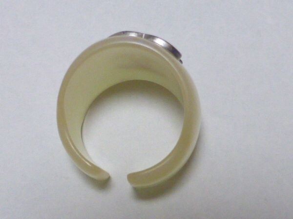リング後ろ側が4mmほど開いたデザインになっていますので若干リング幅は広がるかと思います(あまり広げ過ぎてはプラスティック素材ですので割れてしまうと思います)。リングゲージサイズでは約12.5号くらいです