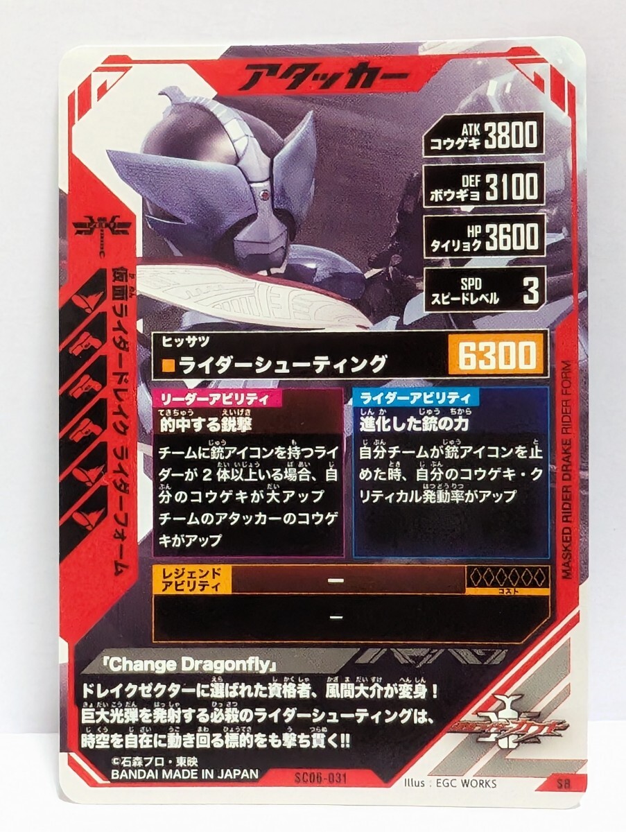 「仮面ライダーバトル ガンバレジェンズSC6章 仮面ライダードレイク ライダーフォーム(SR SC06-031)」を出品します。「おまとめ」可能な方は4枚までミニレター送料85円でお取扱いできます。5枚以上の場合は定形郵便で送料別途計算となります。