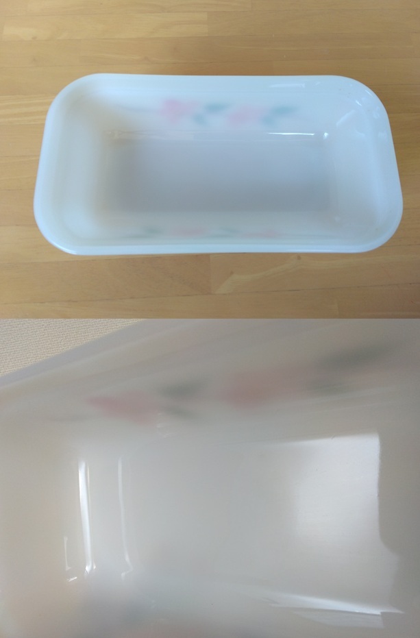 一般家庭向け実用品として販売されたもので、ミルクガラス特有の製造時のよれ、練りムラ、ヘヤライン等があることがあります。
