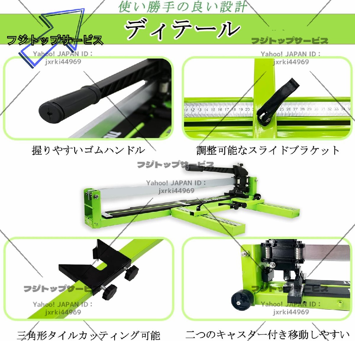 【人間工学に基づいたデザイン】>>この人間工学に基づいた滑り止めゴム製ハンドルは、正確なグリップとプレスを容易にし、使用中の安全性と快適さをユーザーに提供します。 また、幅広で厚みのあるスチールベース、滑り止めゴムパッドにより、タイル切断時に安定した作業を実現します。 製品自体には2つのローラーが付いており、持ち運びがより便利です。