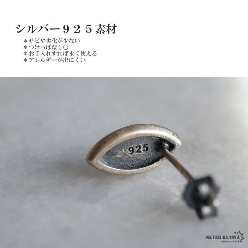 シルバー925は、銀含有率(純度)92.5%を示し、一般的に純銀として扱われています。サビや劣化等がほとんどなく金属アレルギーも出にくいとされており、アクセサリーとして重宝される金属です。