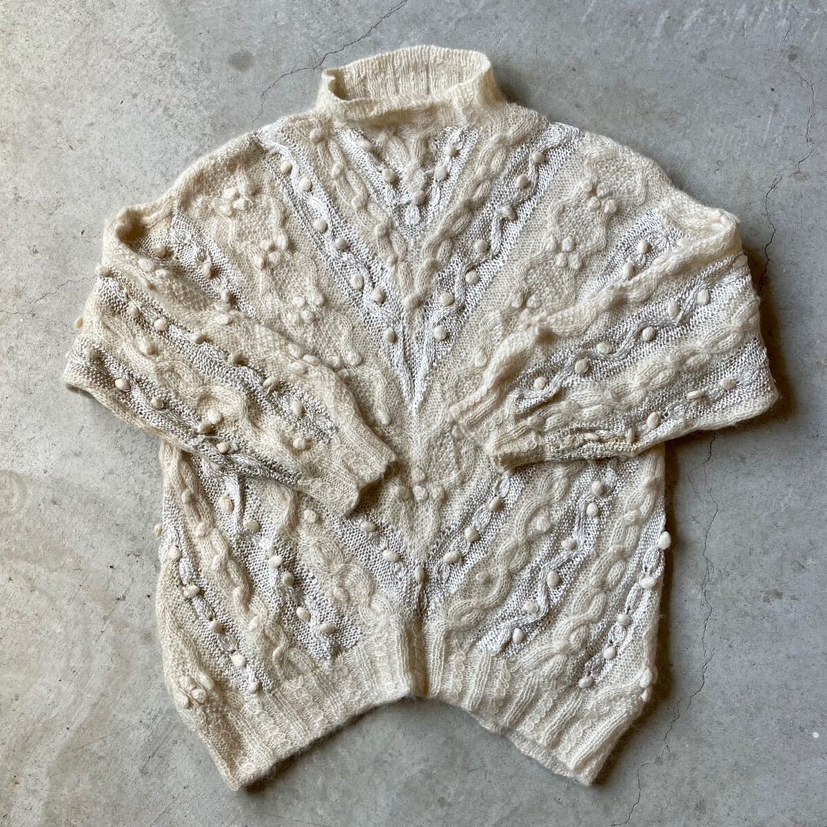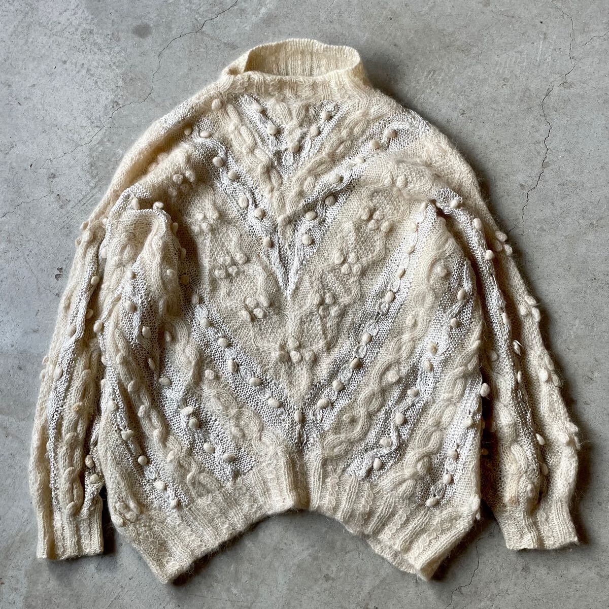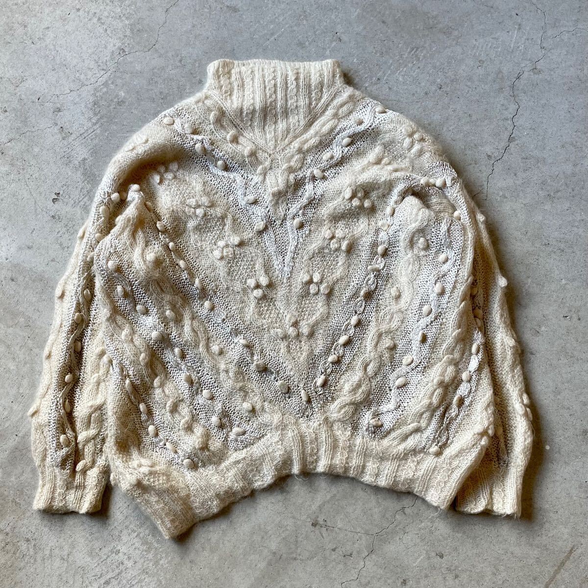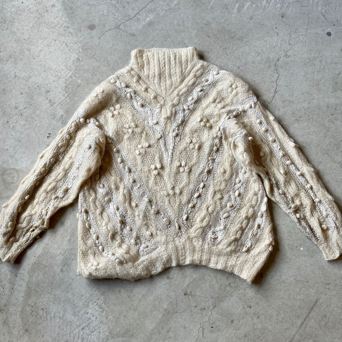 ヴィンテージ 毛45%(モヘア混) レーヨン40% ナイロン15% ポンポン付き ケーブル編みニット ミドルネック セーター アイボリー 古着になります。