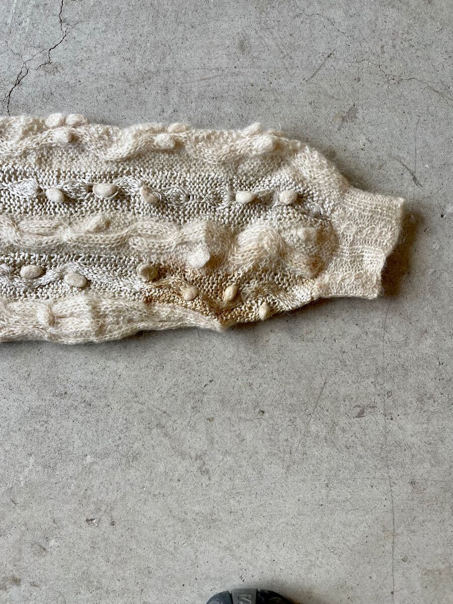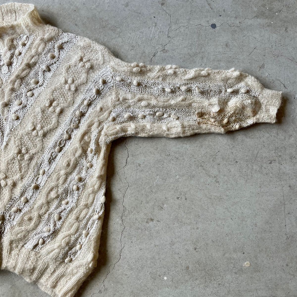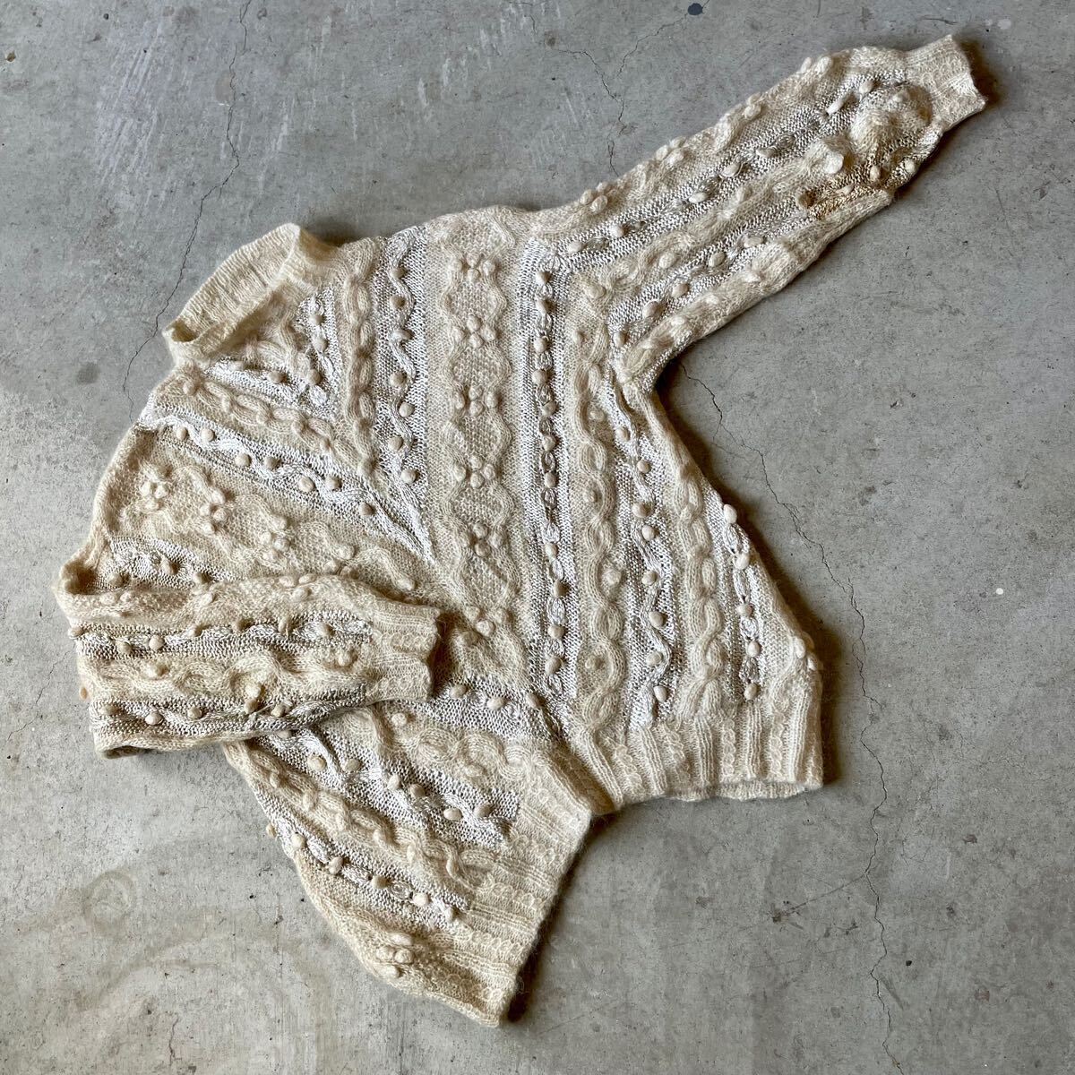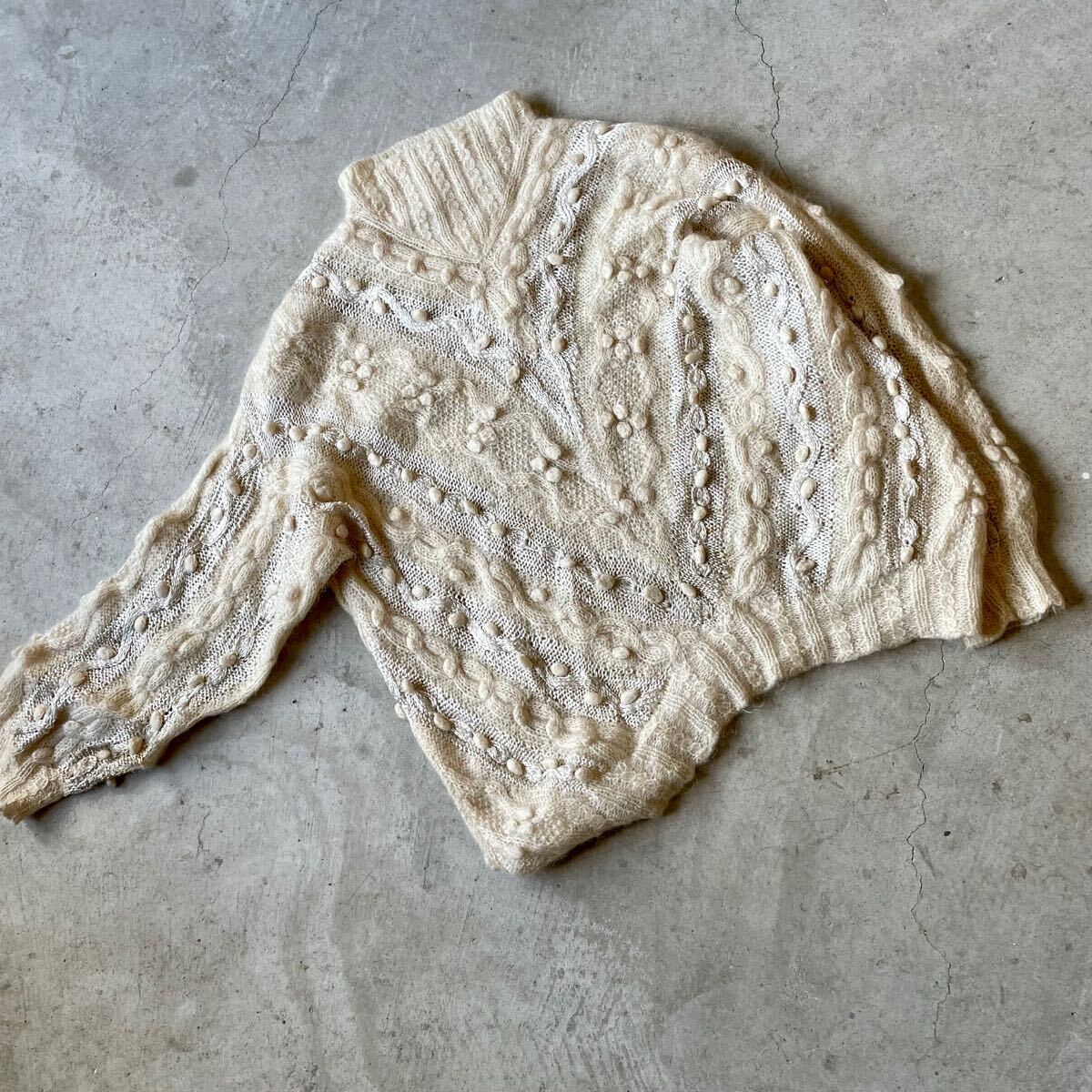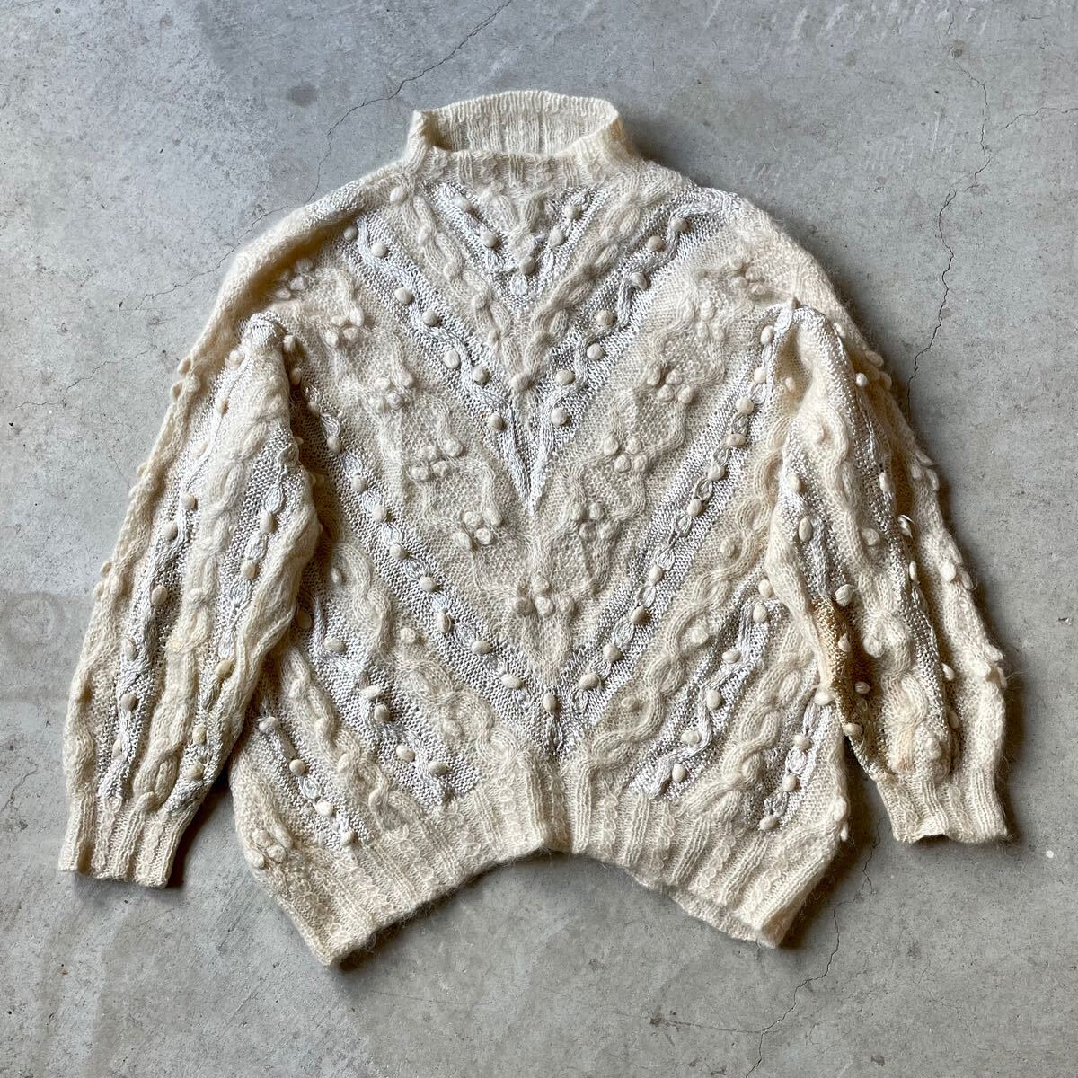 ヴィンテージ 毛45%(モヘア混) レーヨン40% ナイロン15% ポンポン付き ケーブル編みニット ミドルネック セーター アイボリー 古着になります。