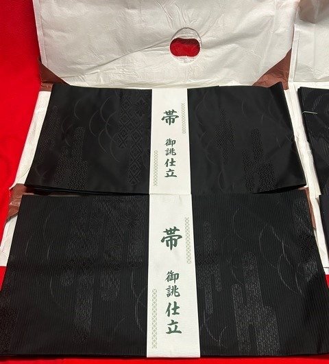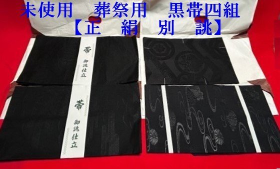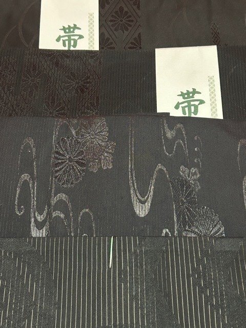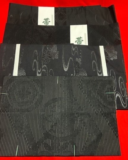 ◇新品【しつけ糸付き 喪服 漆黒帯 4組おまとめ 冬・夏喪服帯 おまとめ 正絹別誂】リメイク 葬儀 貸衣装 Q02113