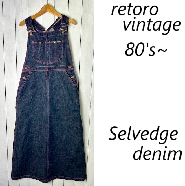 レトロ 美品 80s~ 赤耳セルヴィッジデニム ロングジャンパースカート M 紺 オーバーオールスカート ヴィンテージ サロペットスカート★259