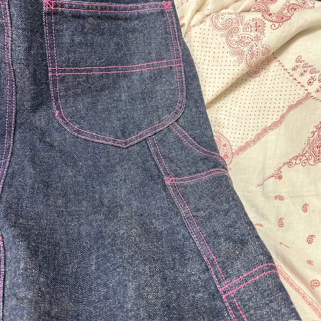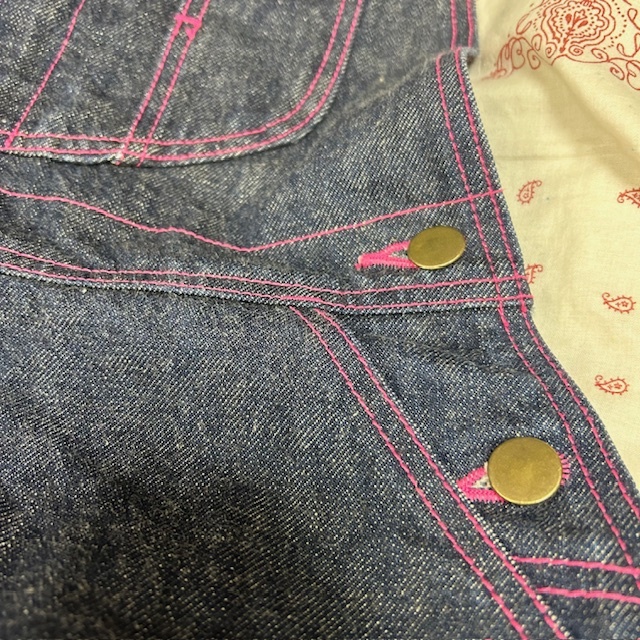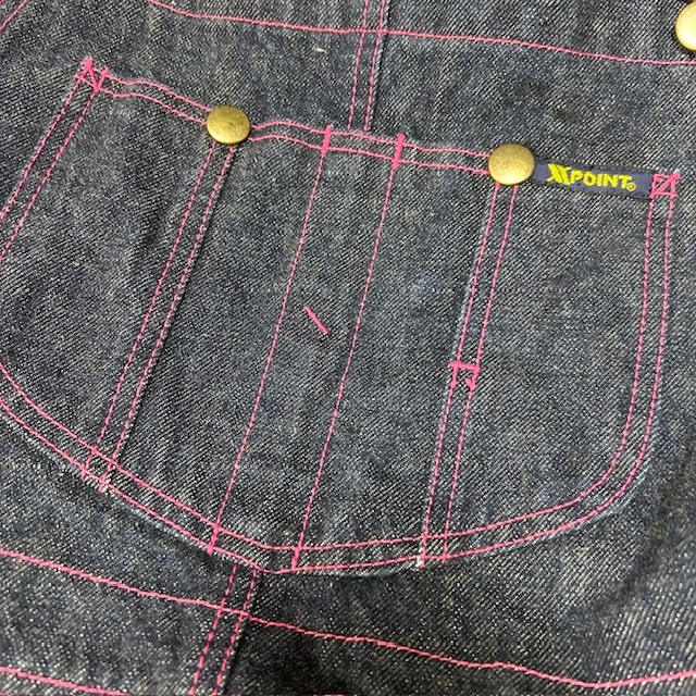 ●商品説明・・・80年代~90年代初め頃のオールド・ヴィンテージの国産レトロなオーバーオール型のロング丈のジャンパースカート(サロペットスカート)です。出品前に洗濯もしておりますが、ほぼ未使用に近い感じの濃紺で産毛の残るミミ付きセルヴィッジデニムで、濃いピンクのステッチがいいアクセントになっています。日本製で、素材はコットンです。サイズ表記はMで、今のやや大きめS~ジャストめM程度のサイズ感かと思います。