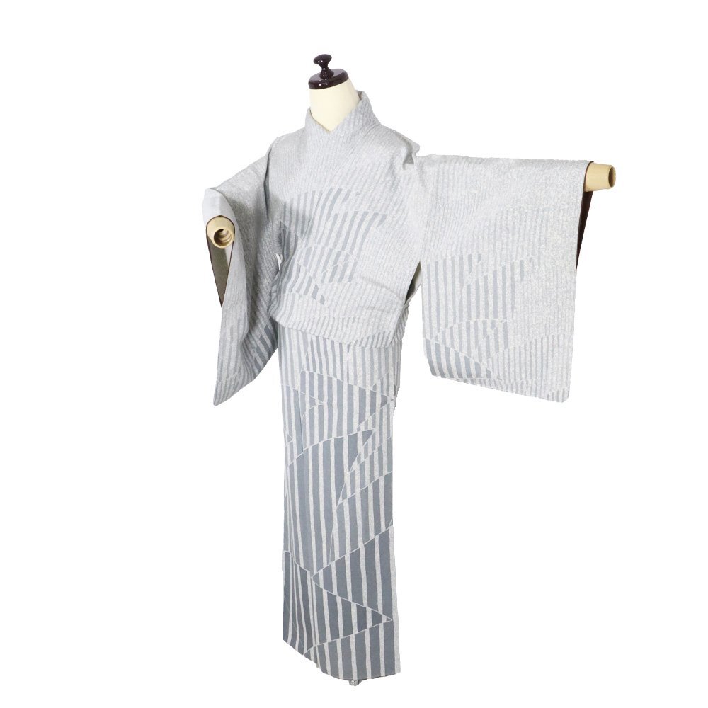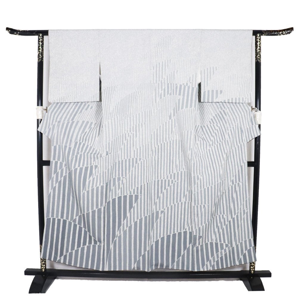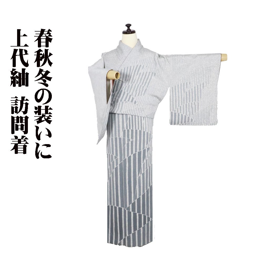 | 上代紬 訪問着 袷 緑(高麗納戸色)・グレー(藍鼠色)・クリーム(藍白) 暈し地 縦縞・裂取文 161 広襟 13号 仕付け付き |