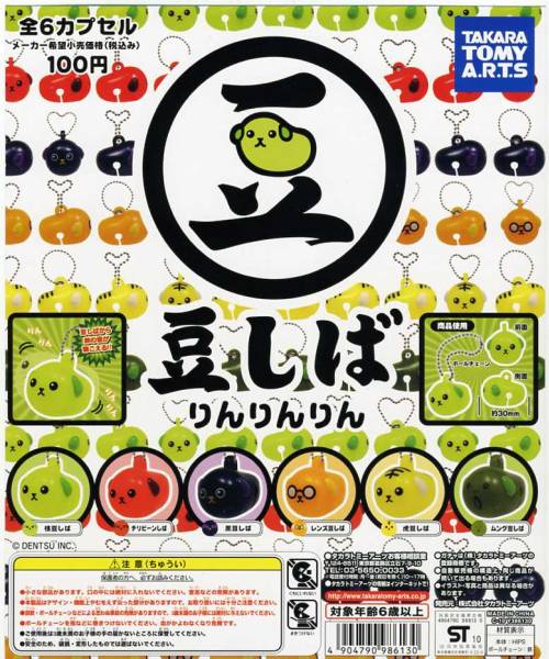 ◆豆しば・りんりんりん♪…全6種+台紙 (枝豆しば/黒豆しば/レンズ豆しば/虎豆しば/ムング豆しば/他) プラ製 鈴マスコット ストラップ