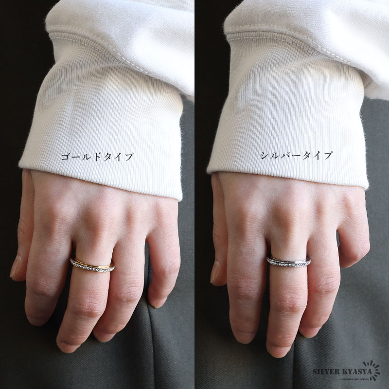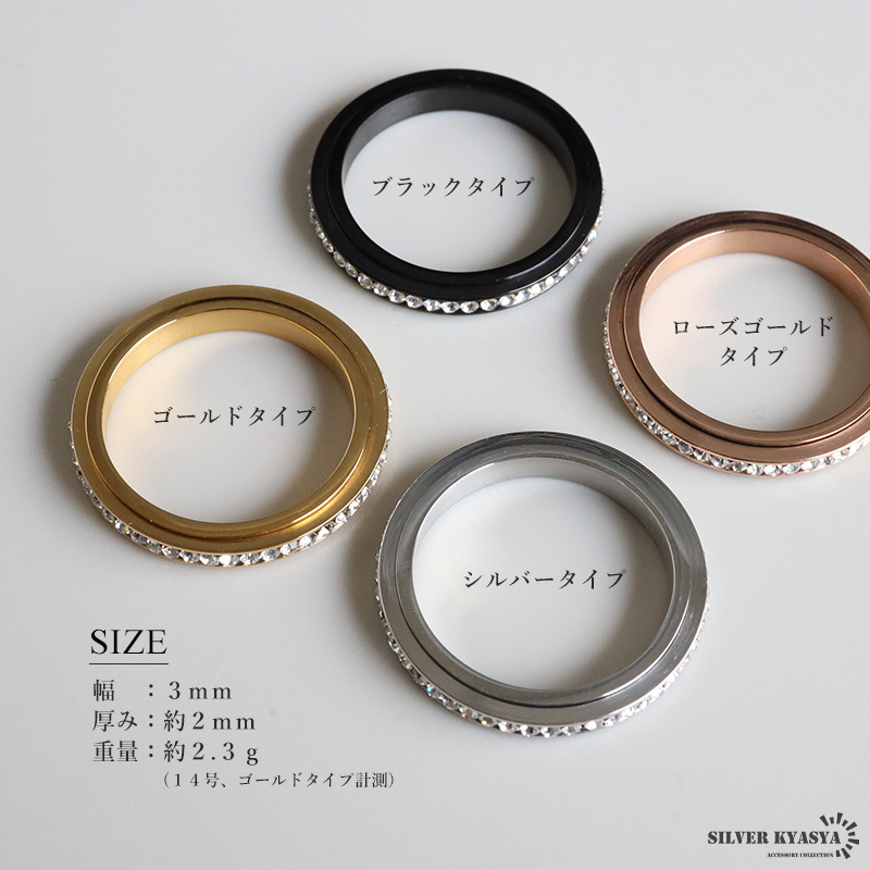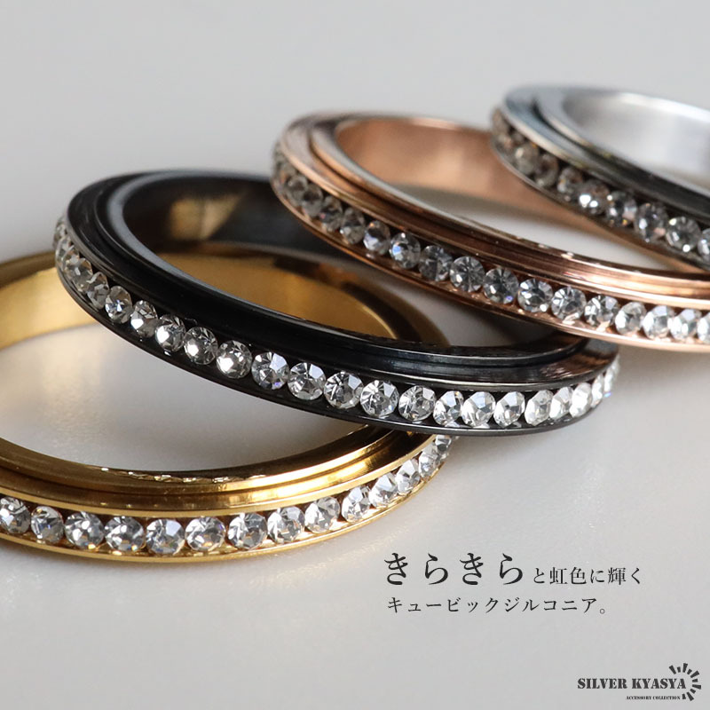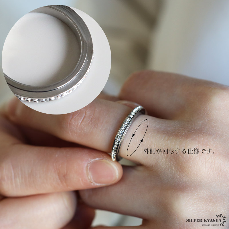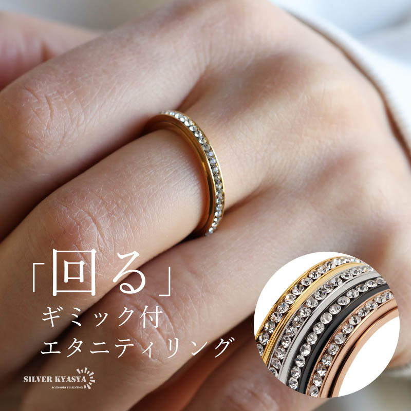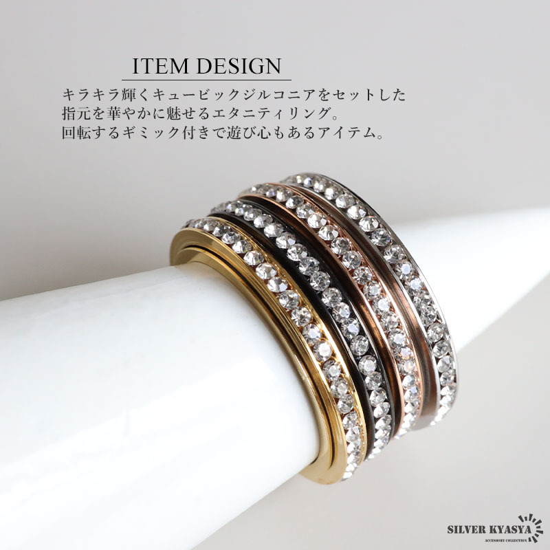| 商品概要 | ■ITEM DETAIL キラキラ輝くキュービックジルコニアをセットした指元を華やかに魅せるエタニティリング。回転するギミック付きで遊び心もあるアイテム。 ■ステンレス素材 金属部分は頑丈なことで知られるステンレス素材を採用。耐久性はもちろん耐水性も高く水場での着用も可能。金属アレルギーも出にくいとされている金属です。 |