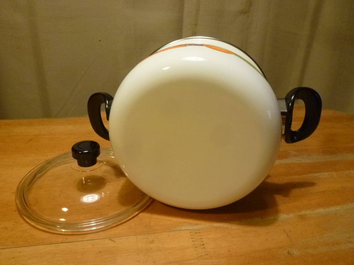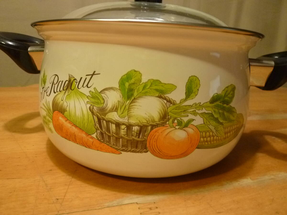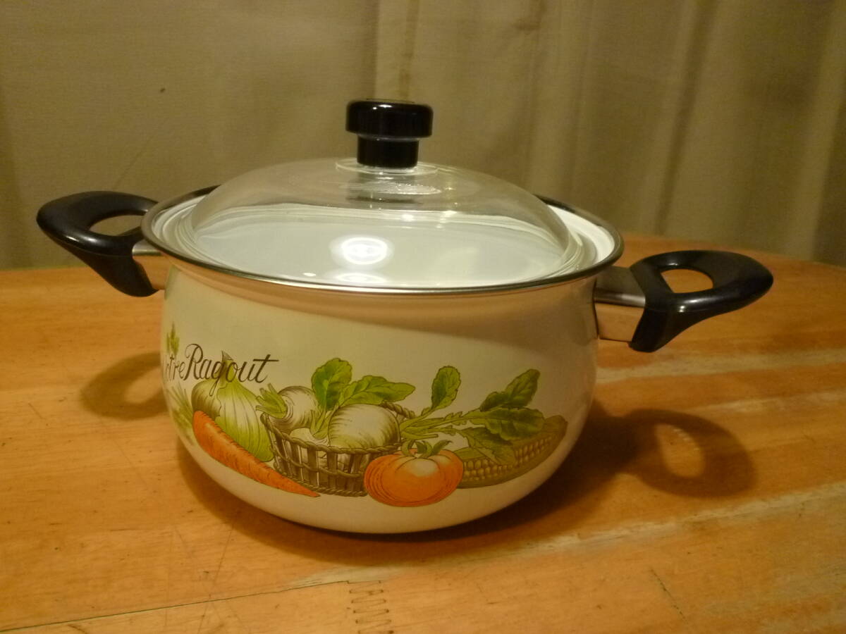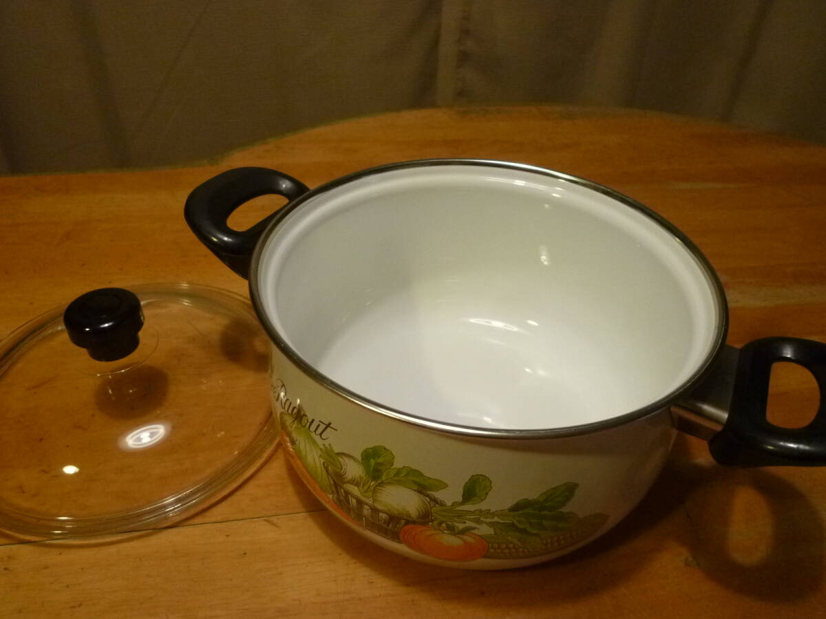 こちらはホーロー製の鍋 小 未使用品になります。色鮮やかな野菜とそれに関すると思われる英字の文字プリントがオシャレで、フタは厚手のガラス製です。