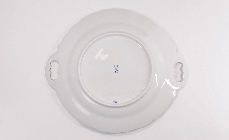 絵をよくみますとマイセンの双剣マークが紛れており、それを主張しているようです。本アイテムはリムにハンドルとしての透かし・並びに陽刻が装飾され通常のケーキプレートとはまた違った味わい深さがございます。 裏にはマイセンマークにそれぞれのナンバーもしっかりと入った御品です。